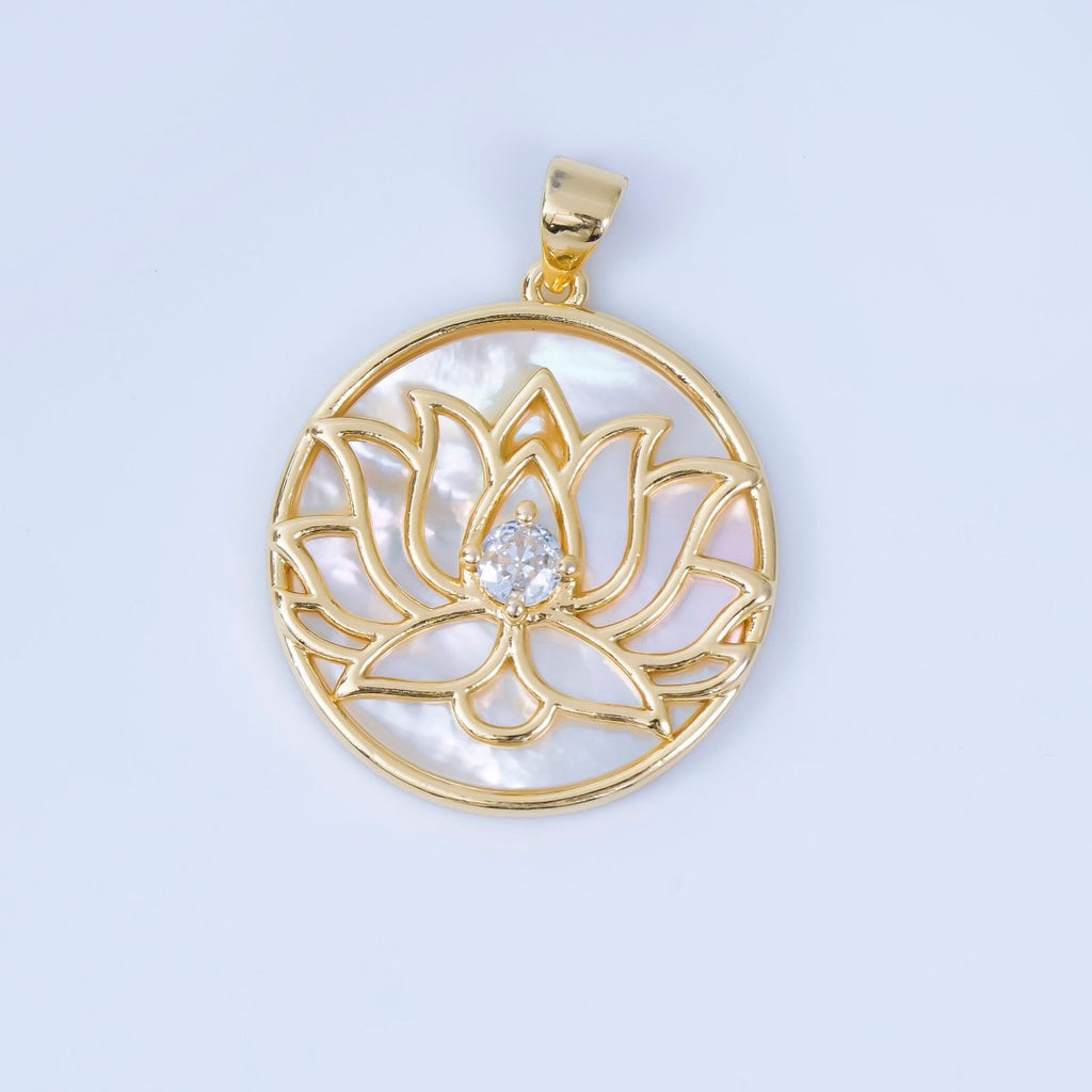 24K Gold Filled 26mm Shell Pearl White Lotus Flower Medallion Pendant | AA-1605