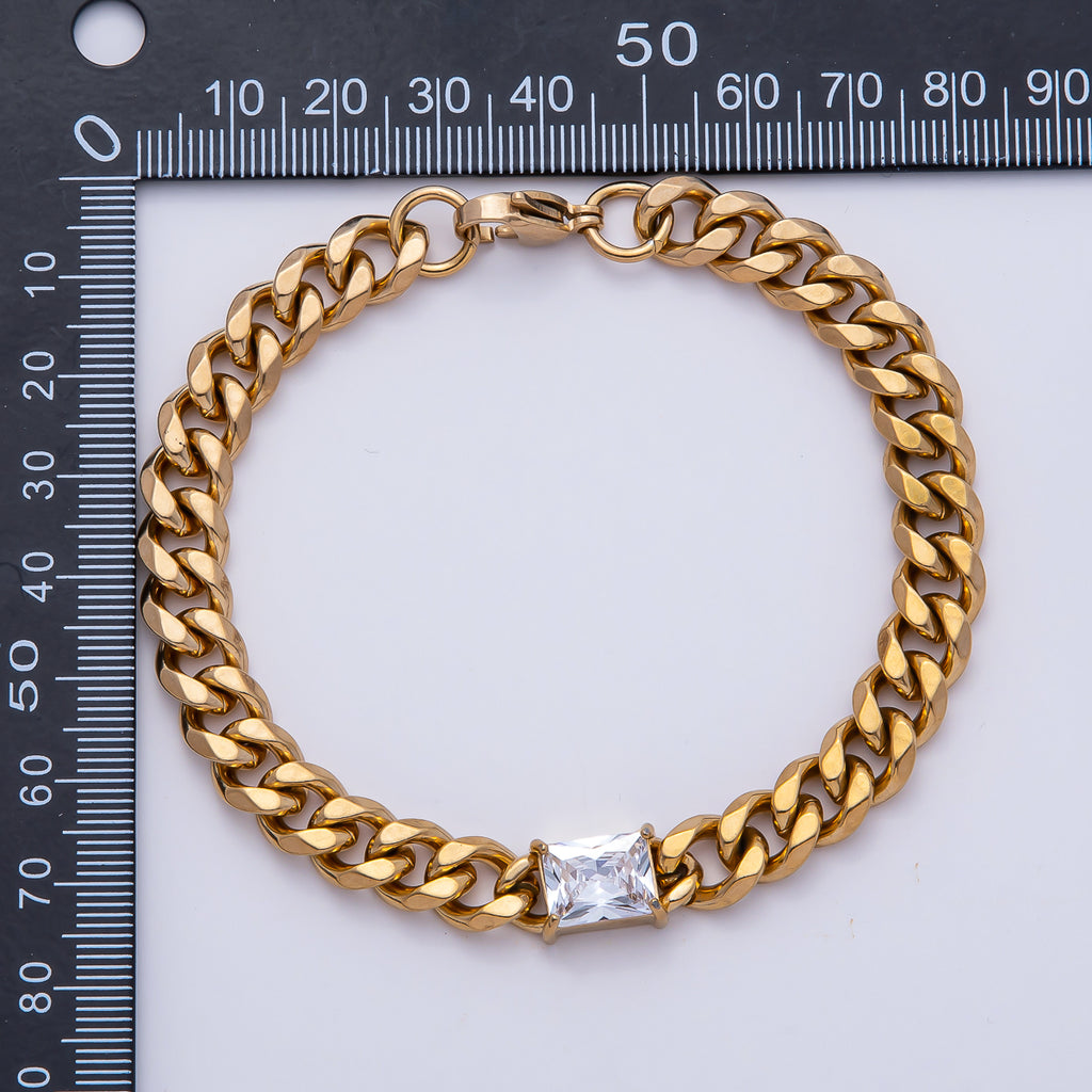 Gold Stainless Steel 9mm Baguette CZ Curb Chain 9 Inch Statement Bracelet | BR-2023