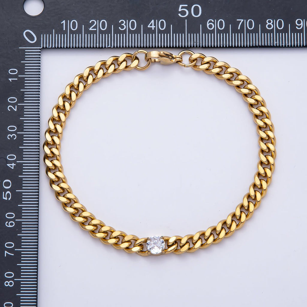 Gold Stainless Steel 6mm Clear CZ Curb Chain 8.86 Inch Bracelet | WA-04159