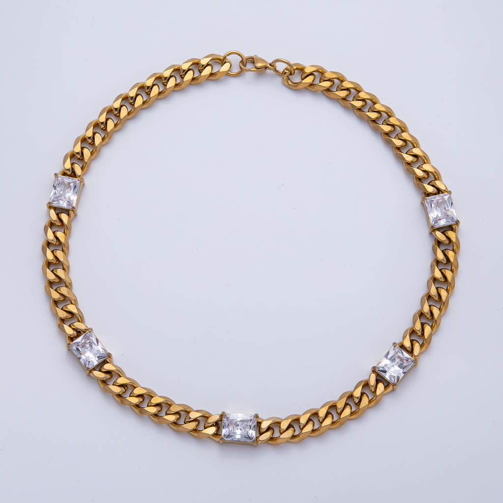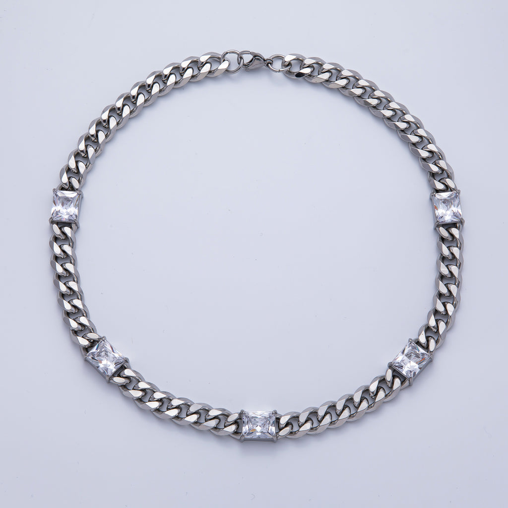 Stainless Steel 12mm Clear CZ Baguette Curb Chain 18 Inch Necklace in Gold & Silver | WA-3941 WA-3942