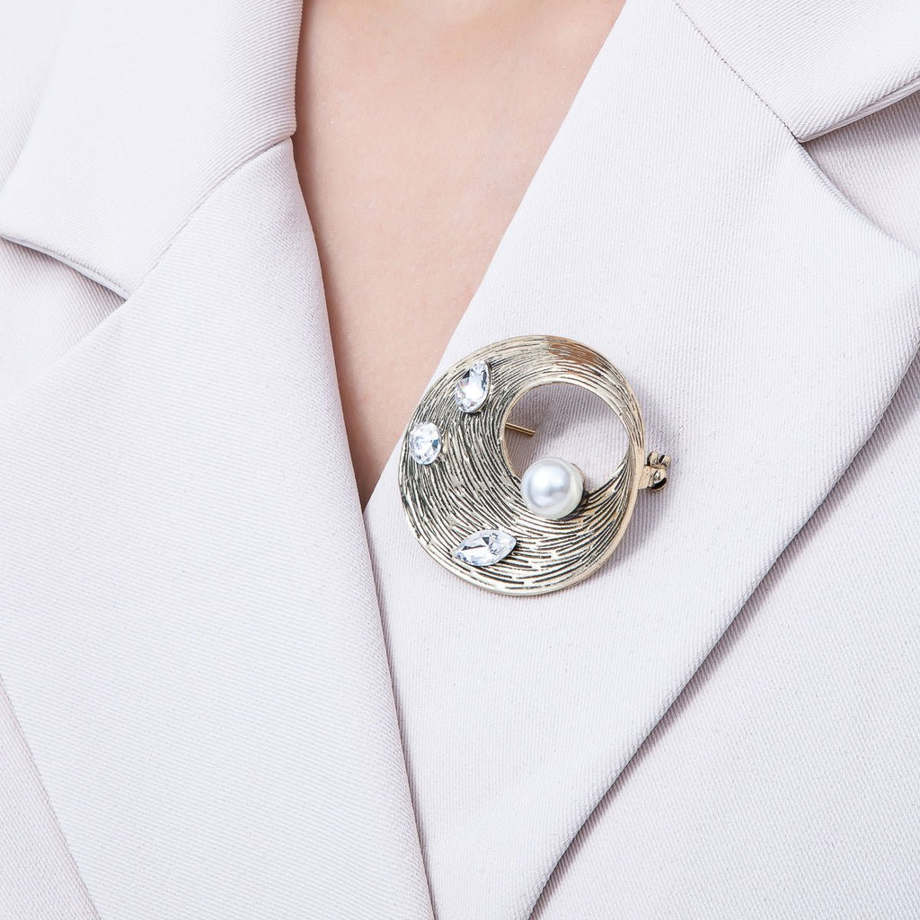 Vintage Antique Gold 41mm Mix Cut CZ Single Shell Pearl in Twist Band Brooch Pin | BH-027