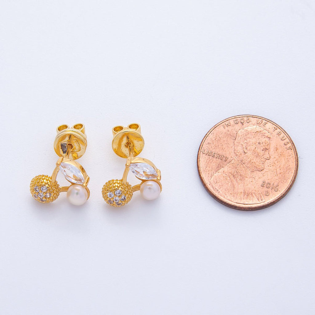 18K Gold Filled 15mm Micro Paved CZ Shell Pearl Cherry Fruit Stud Earrings | A1677