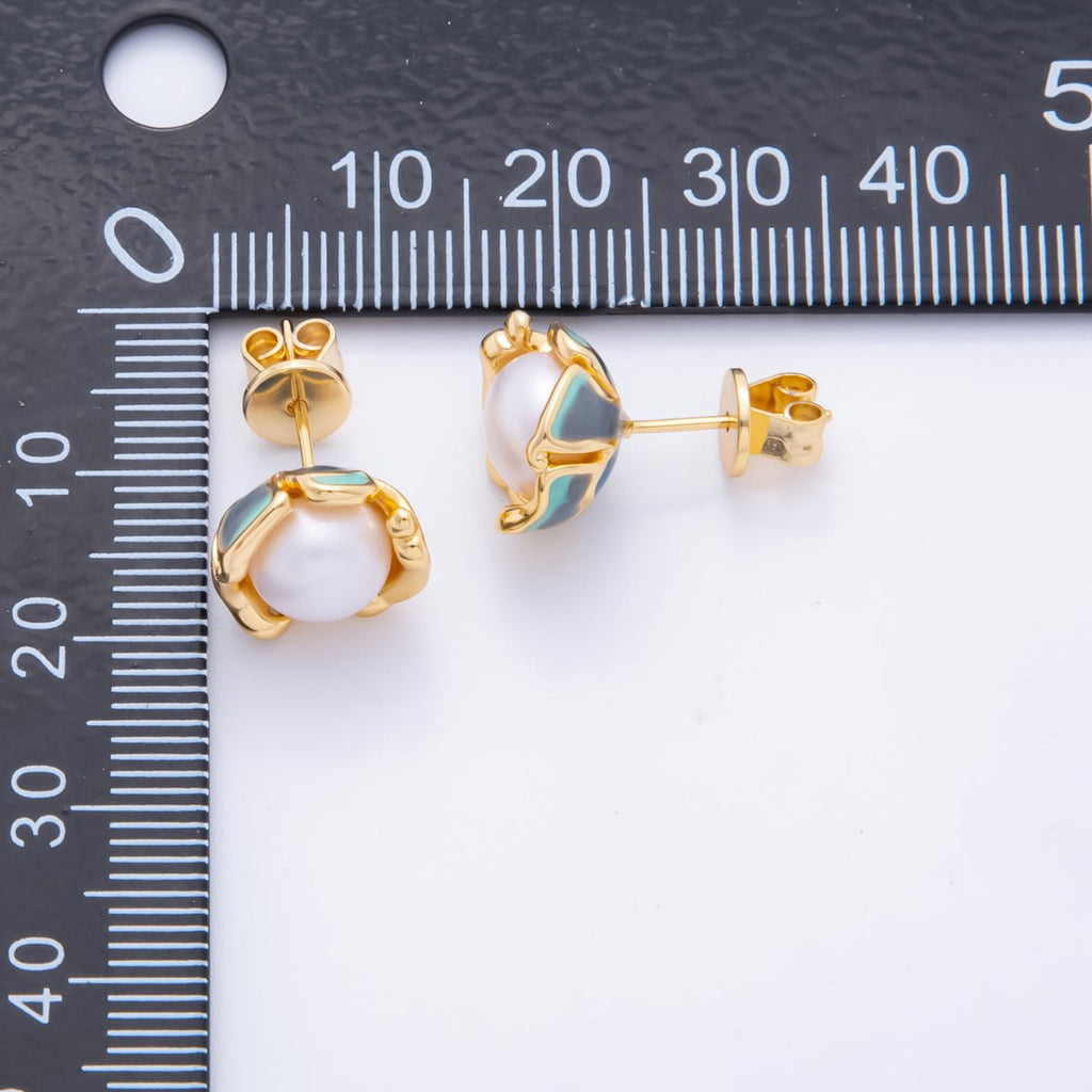 18K Gold Filled Shell Pearl Blue Flower Petal Mini Stud Earrings | AJ193