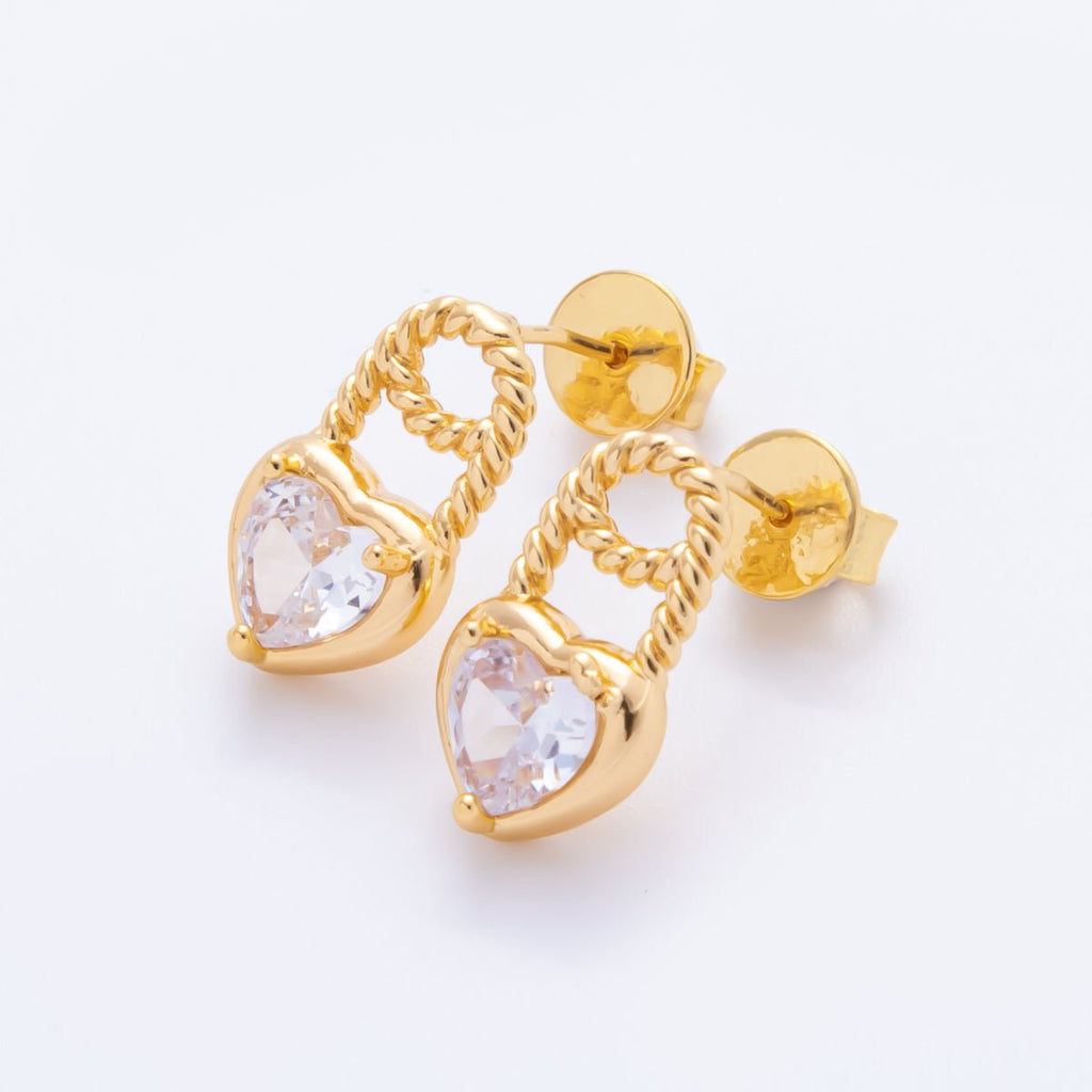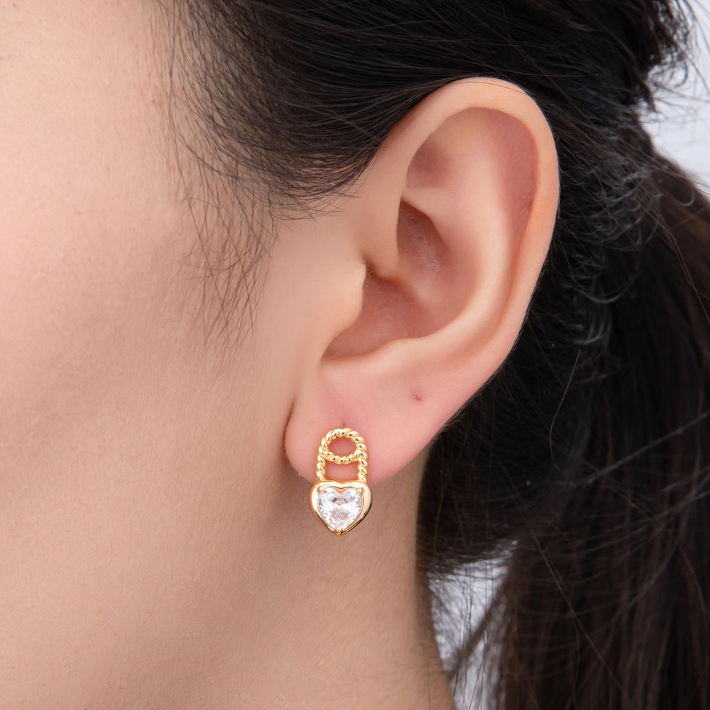 18K Gold Filled Clear Heart CZ Croissant Padlock Drop Studs Earrings | AJ-180