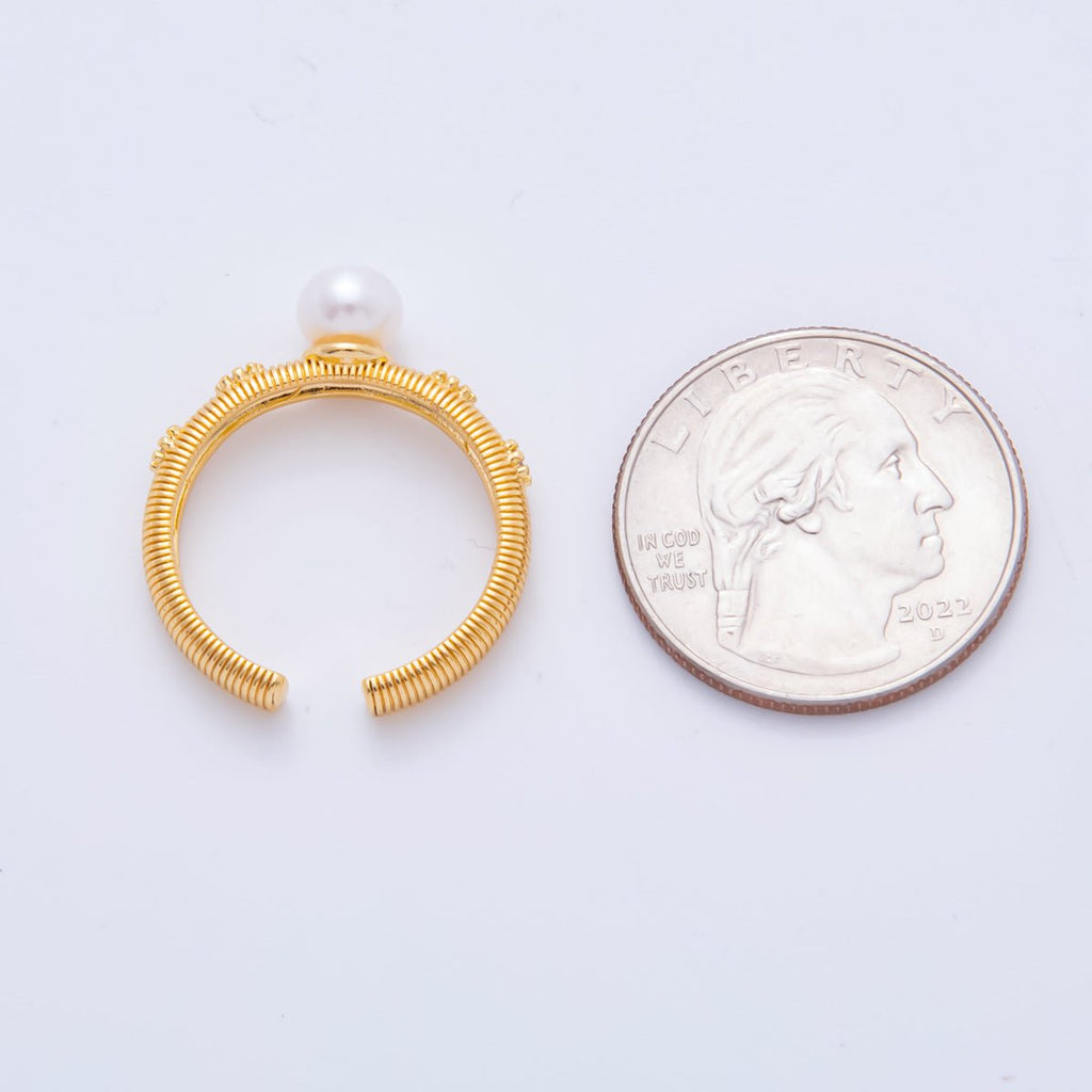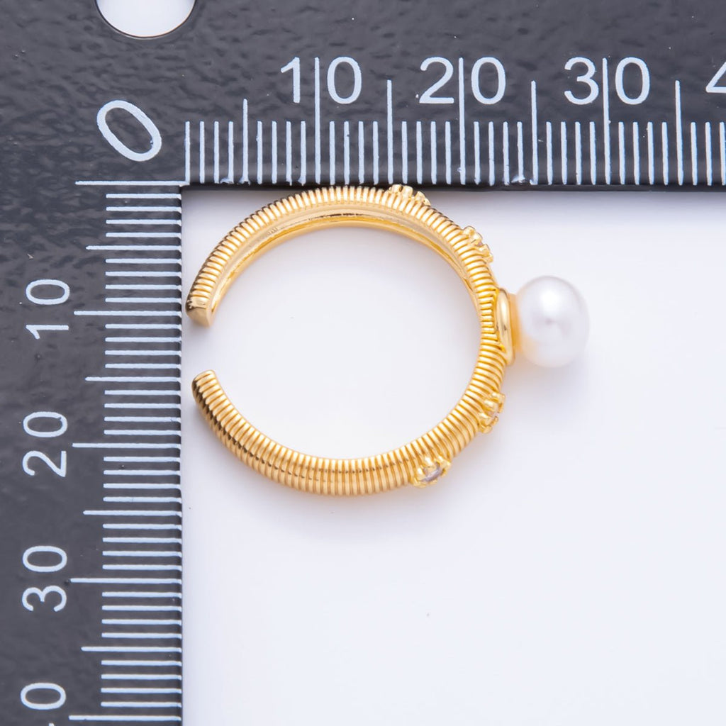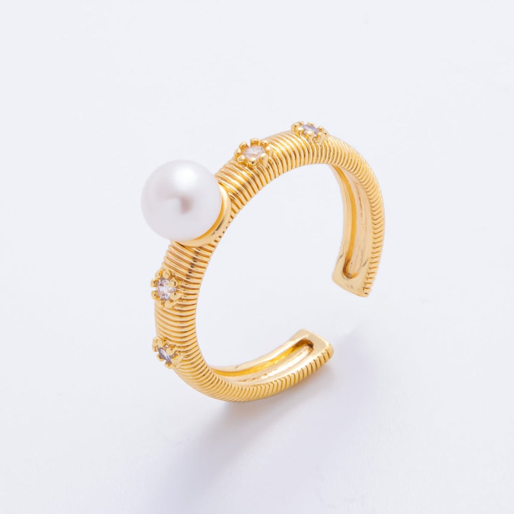 18K Gold Filled Shell Pearl Solitaire CZ Lined Ribbed Adjustable Ring | O-042