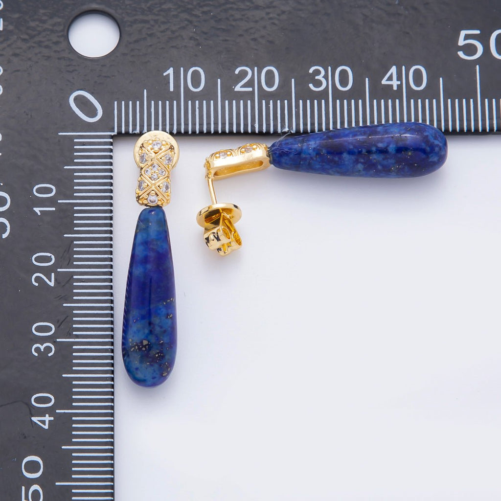 18K Gold Filled Lapis Lazuli Drop Micro Paved CZ Quilted Drop Stud Earrings | AJ231