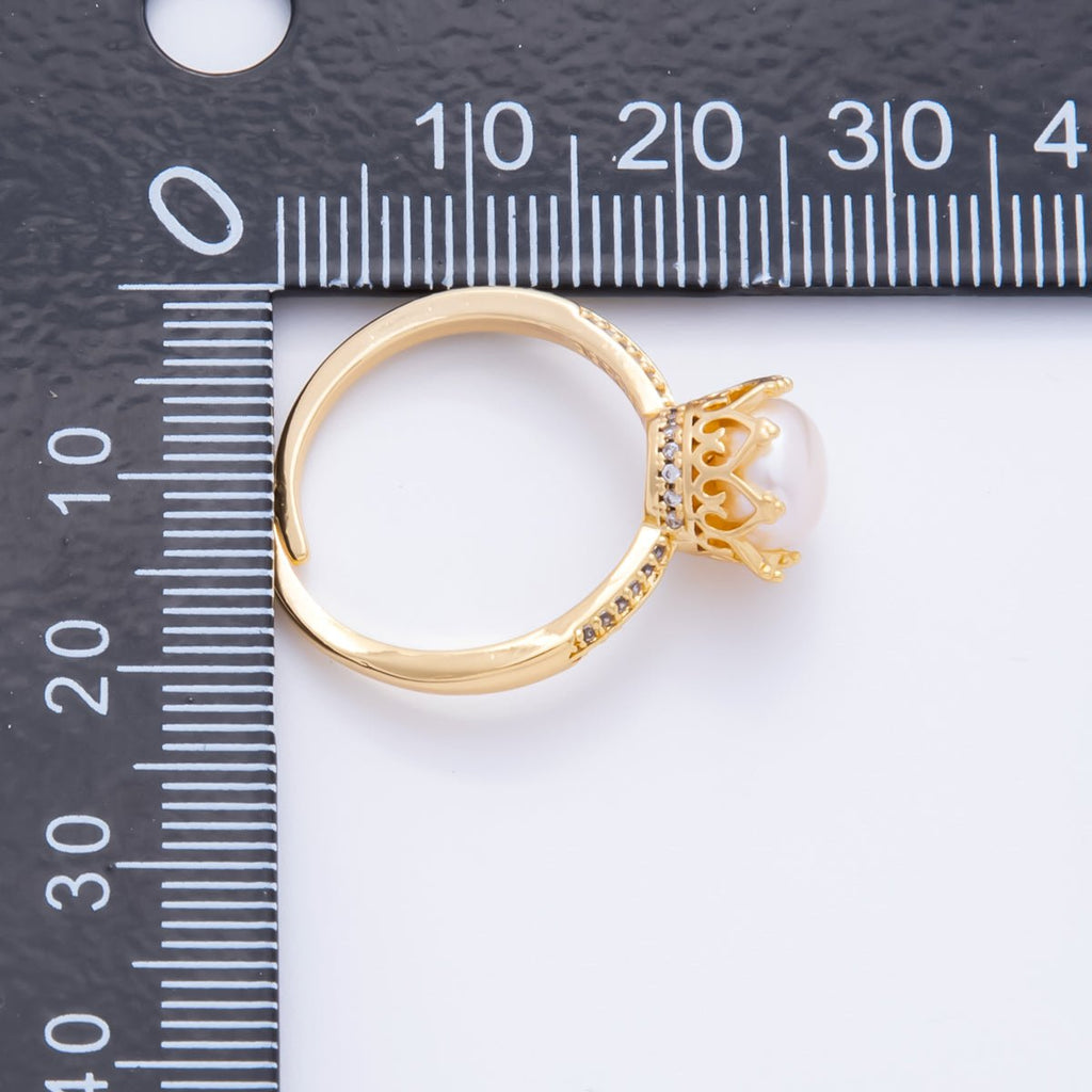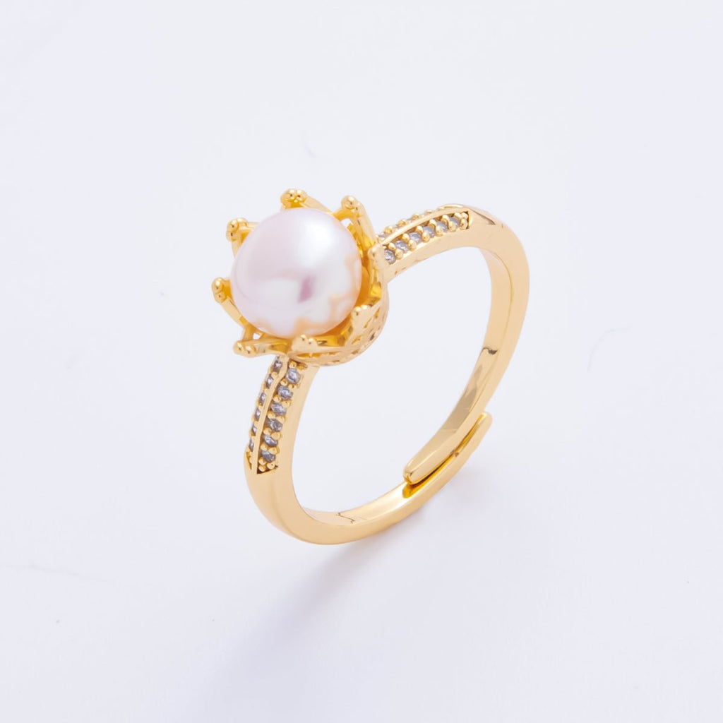18K Gold Filled Shell Pearl Solitaire Micro Paved CZ Adjustable Ring | O-041