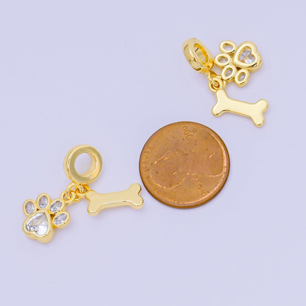 24K Gold Filled 12.5mm Oval & Heart CZ Dog Pet Set Charm in Paw & Bone | AH-648