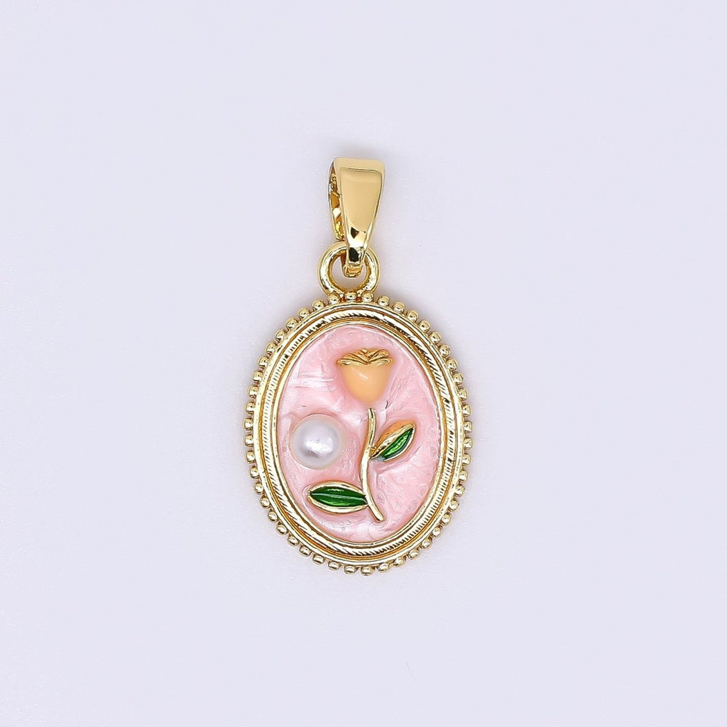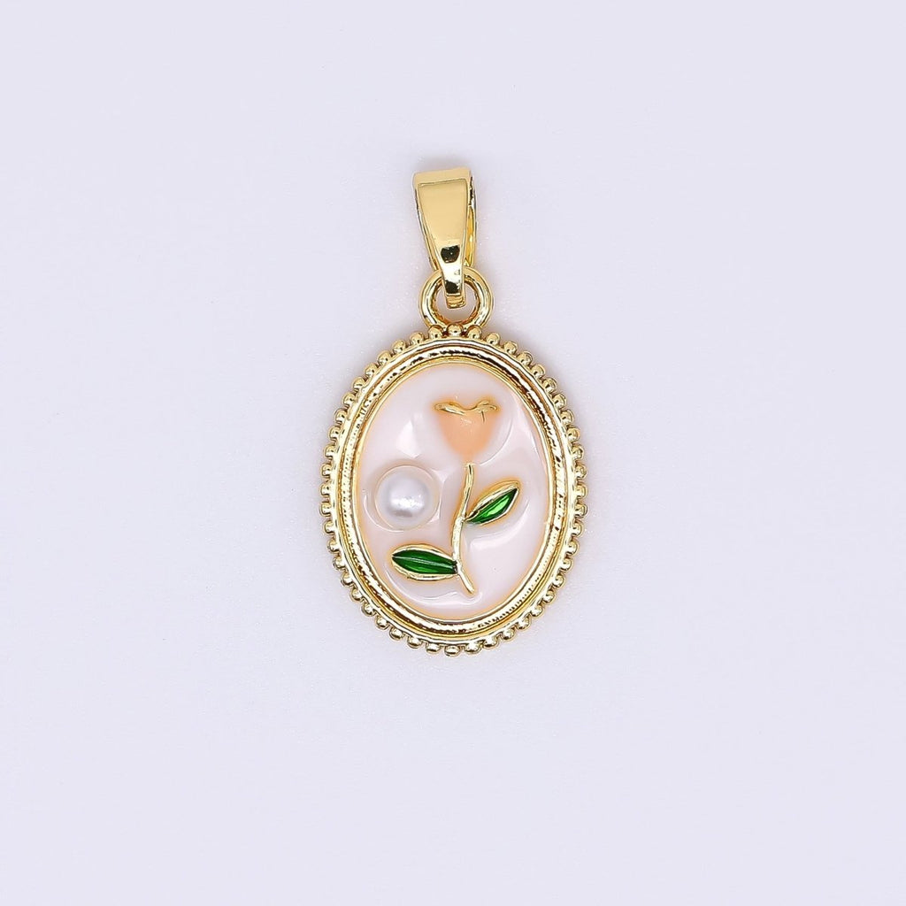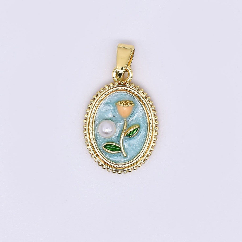 24K Gold Filled 12mm Enamel Shell Pearl Framed Vintage Style Flower Pendant in Blue, Pink, & Purple | AH-506 AH-507