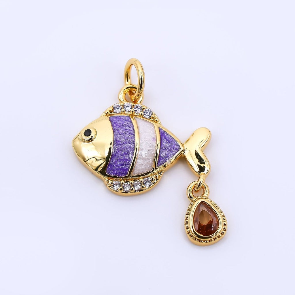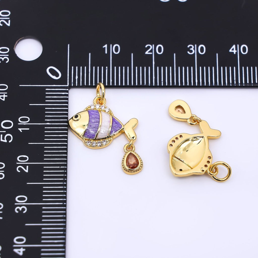 24K Gold Filled 13mm Micro Paved, Brown Teardrop, & Purple CZ Ocean Tiny Sea Fish Drop Charm | AF-516
