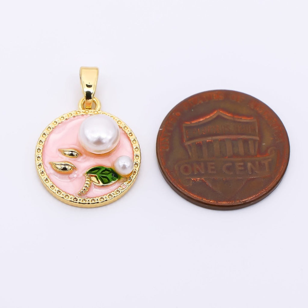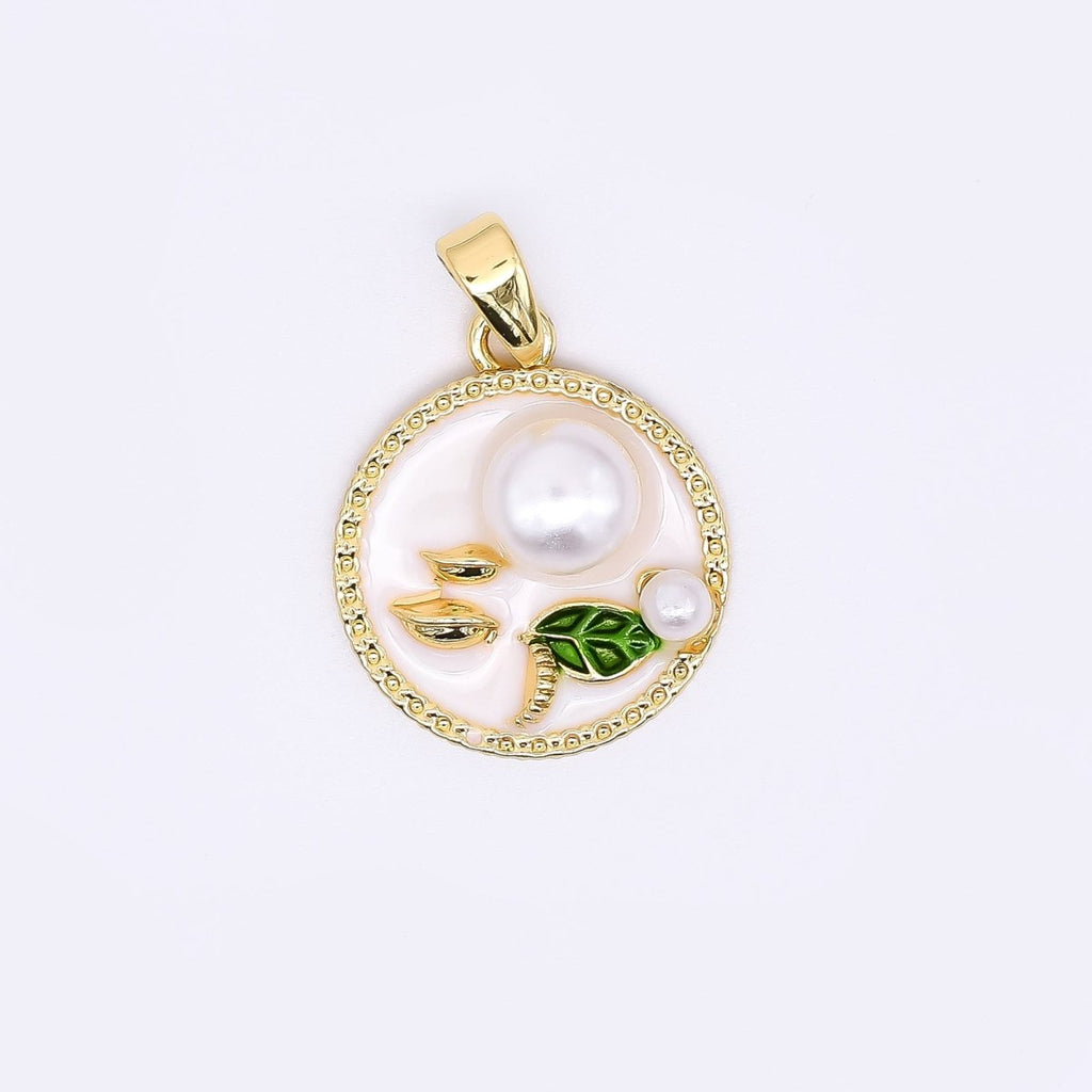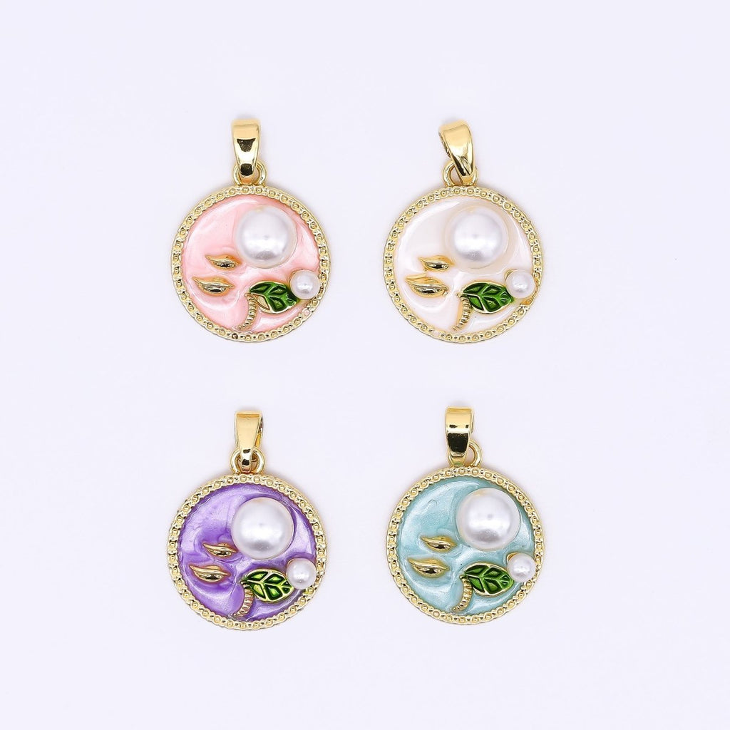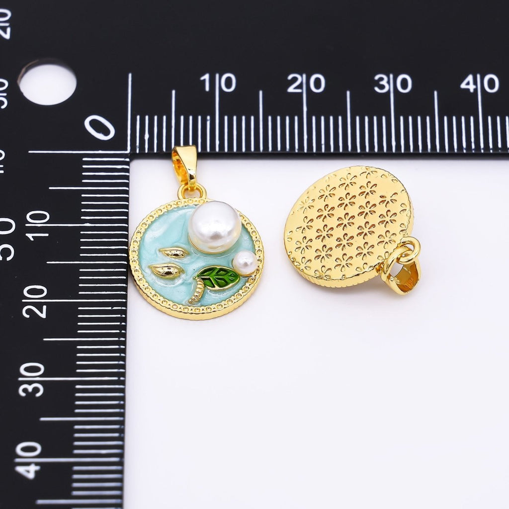 24K Gold Filled 17mm Enamel Art Shell Pearl Pearly Flowers Medallion Pendant in Green, Pink, & Purple | AH-508 AH-509