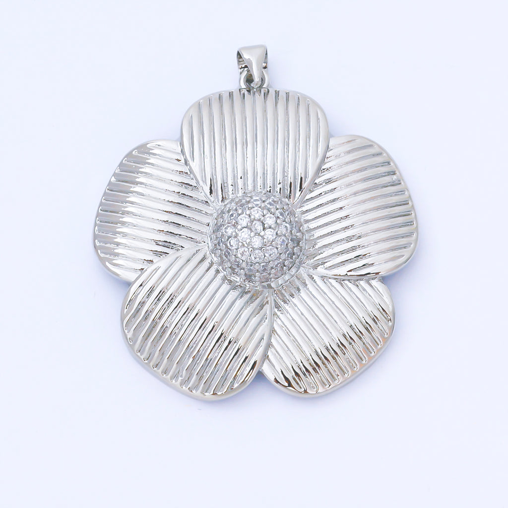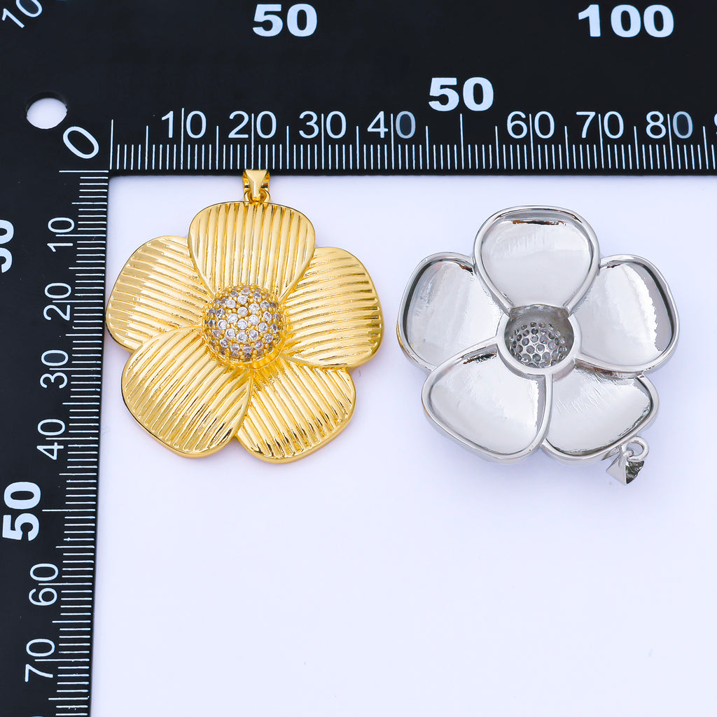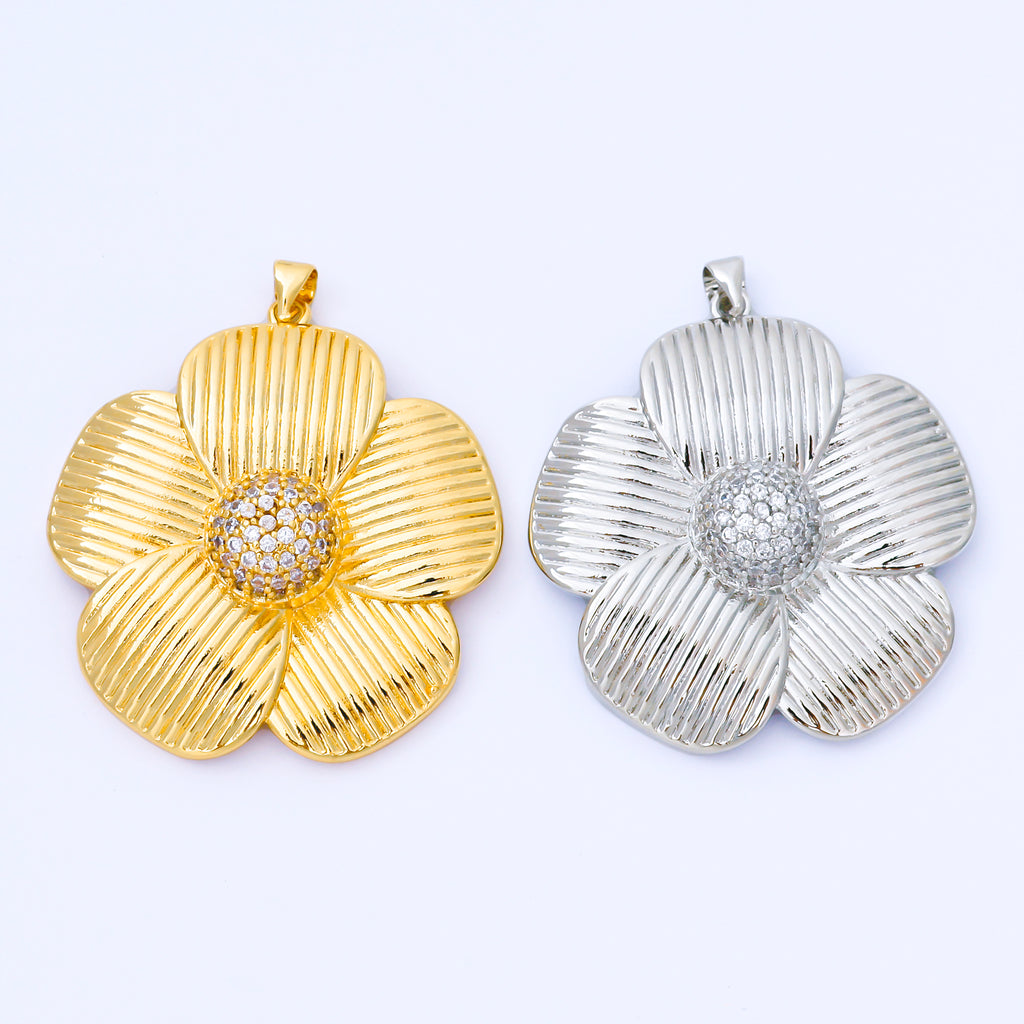 24K Gold Filled 41mm Micro Paved CZ Ribbed Flower Pendant in Gold & Silver | AA1657 AA1660