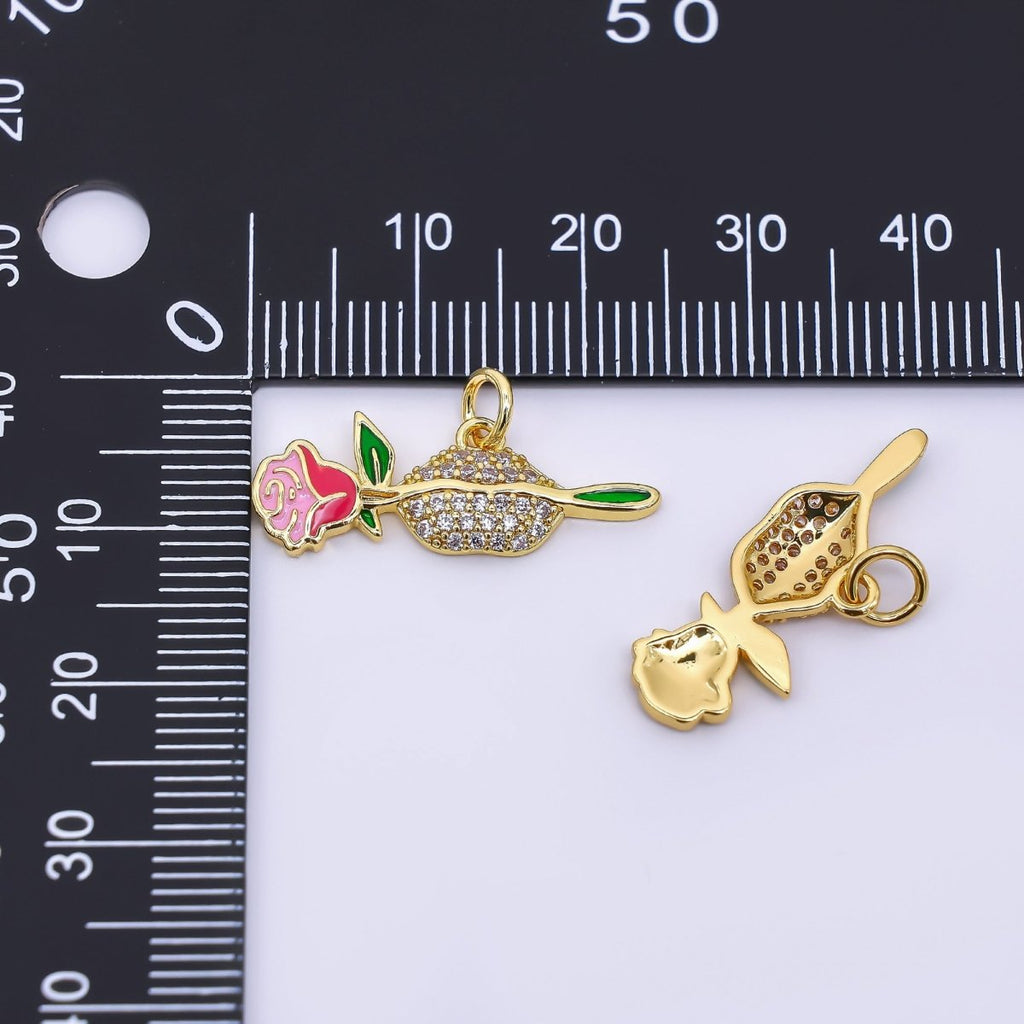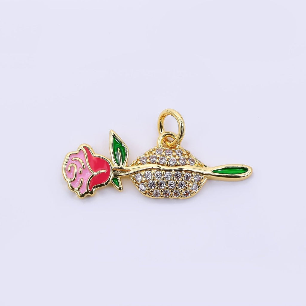 24K Gold Filled 9mm Micro Paved CZ Enamel Art Lips & Rose Flower Charm | AF-514