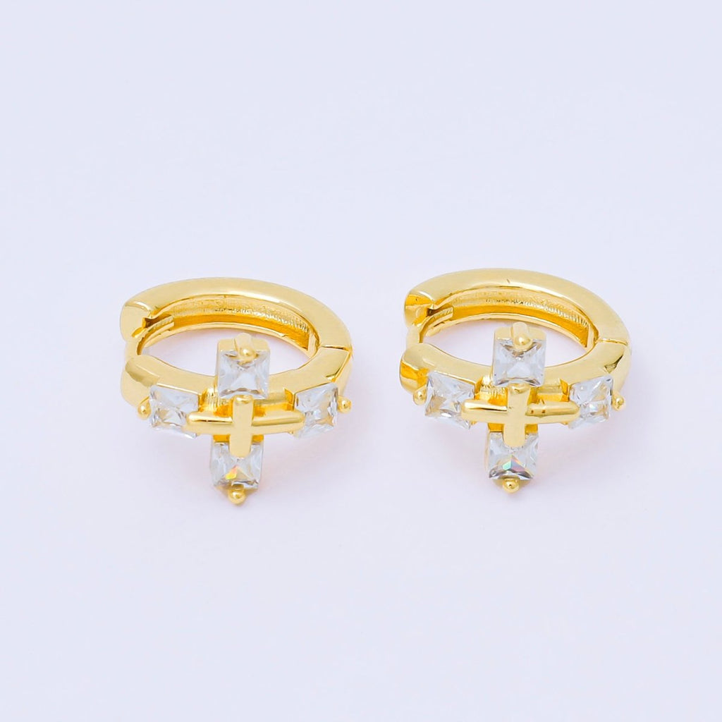 24K Gold Filled 17mm Square Baguette CZ Religious Cross Huggie Earrings | AB1565