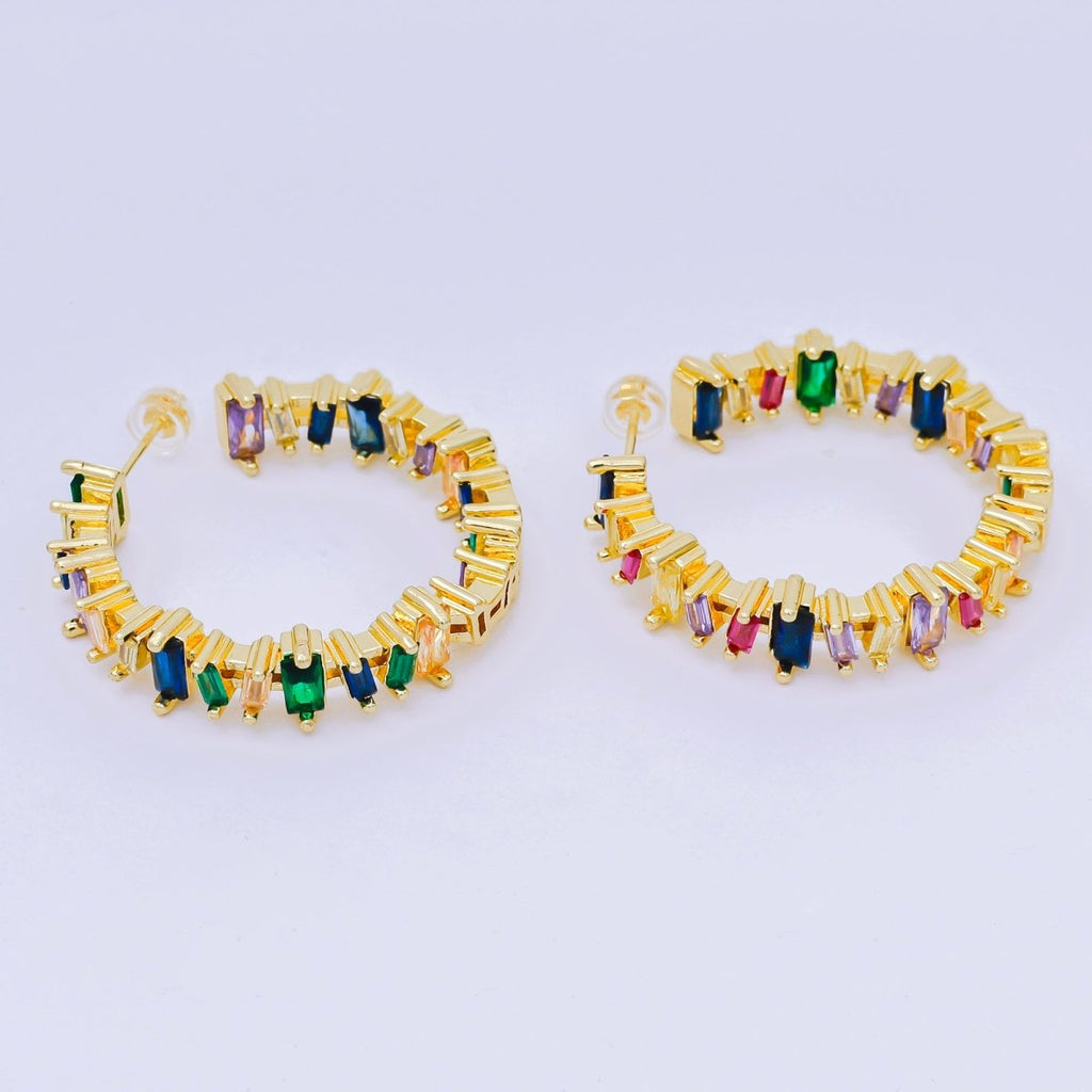 24K Gold Filled 37mm Multicolor CZ Baguette C-Shaped Hoop Earrings | AJ109