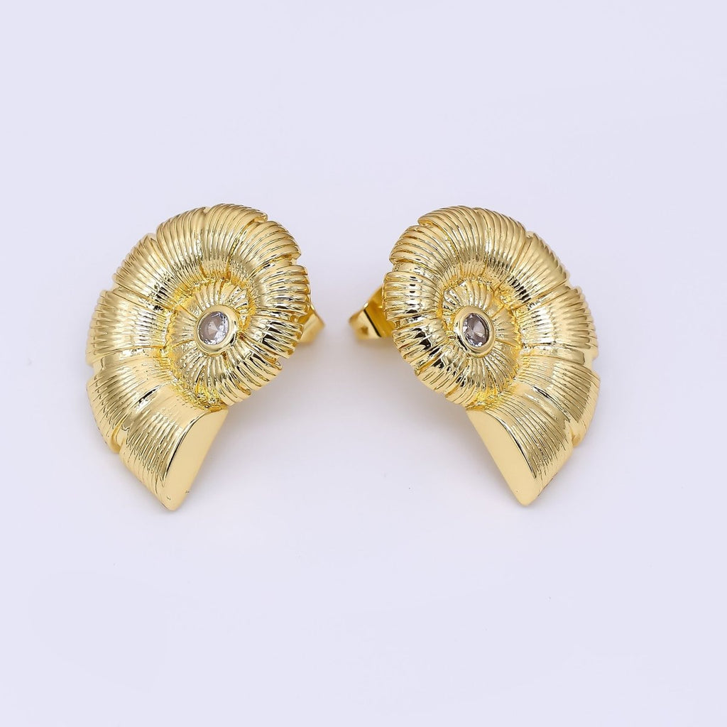 24K Gold Filled CZ Ammonite Shell Stud Earrings Beach Jewelry Inspired | AJ-074