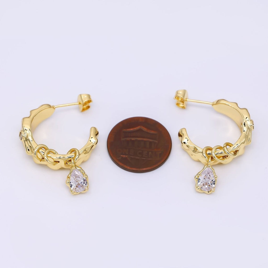 24K Gold Filled 21mm Clear Teardrop CZ Molten C-Shaped Hoop Drop Earrings | AJ075