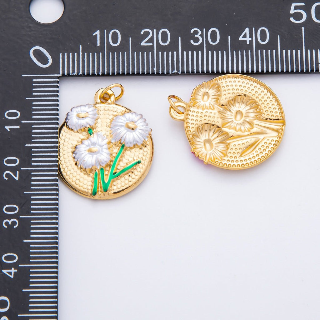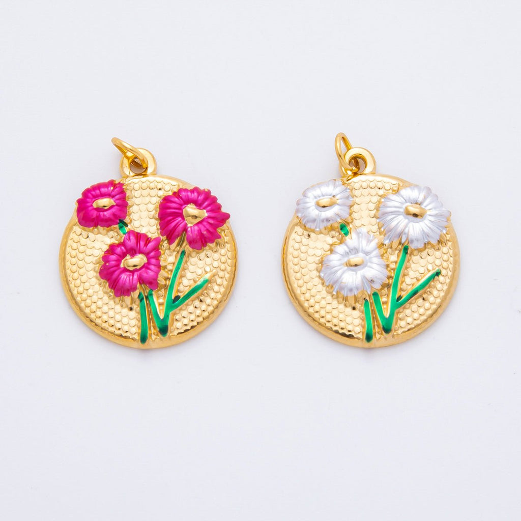 Gold Stainless Steel 26.5mm Fuchsia & White Enamel Flower in Coin Charm | J683