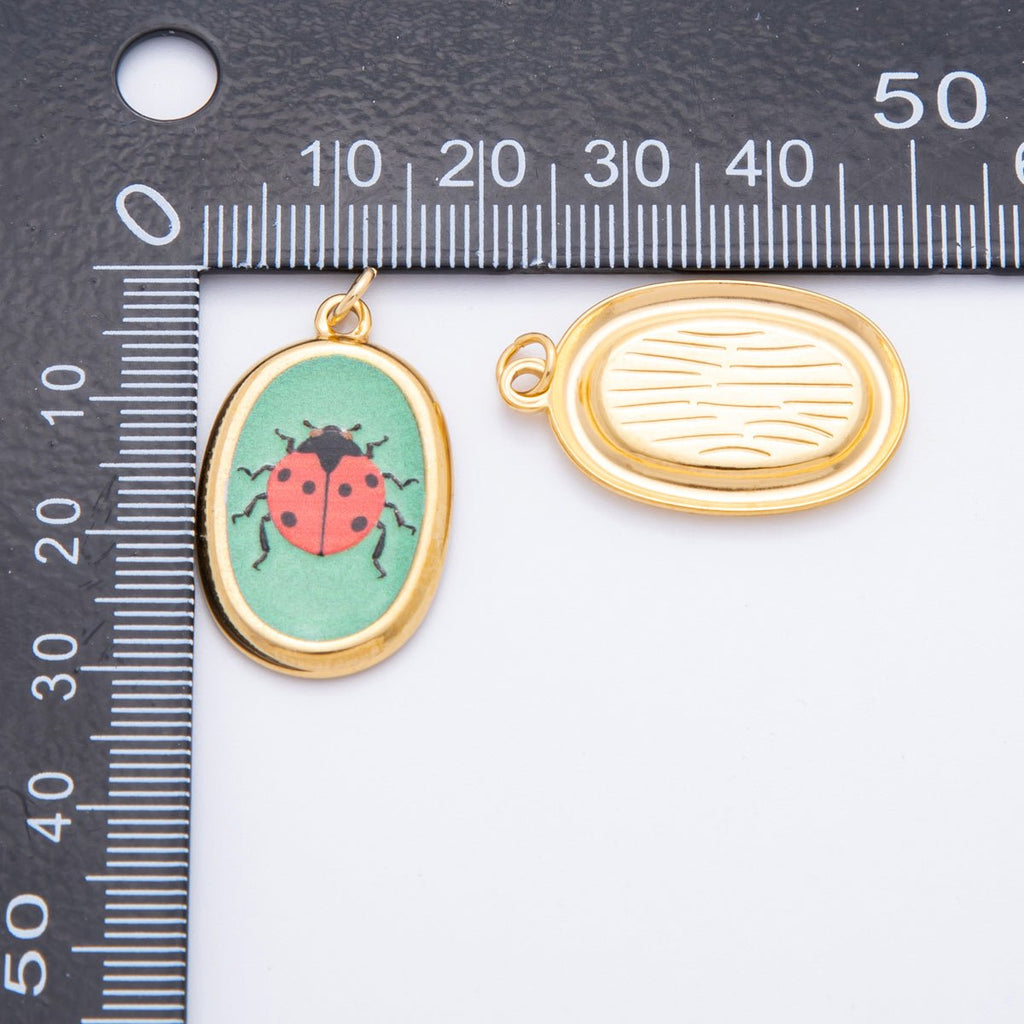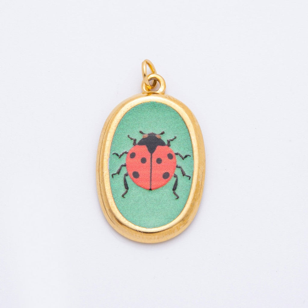 Gold Stainless Steel 31mm Hand-Painted Enamel Oval Ladybug Insect Charm | J420