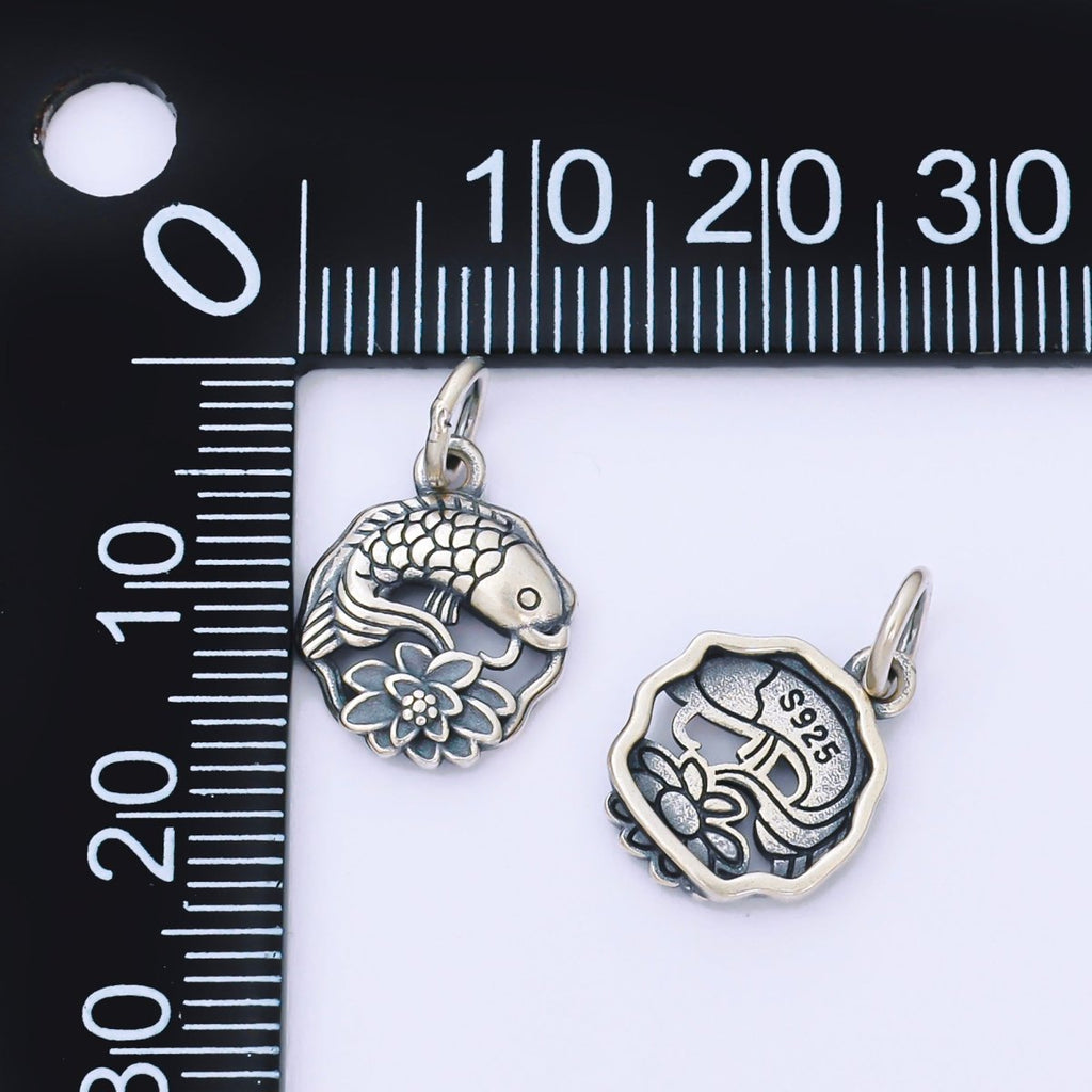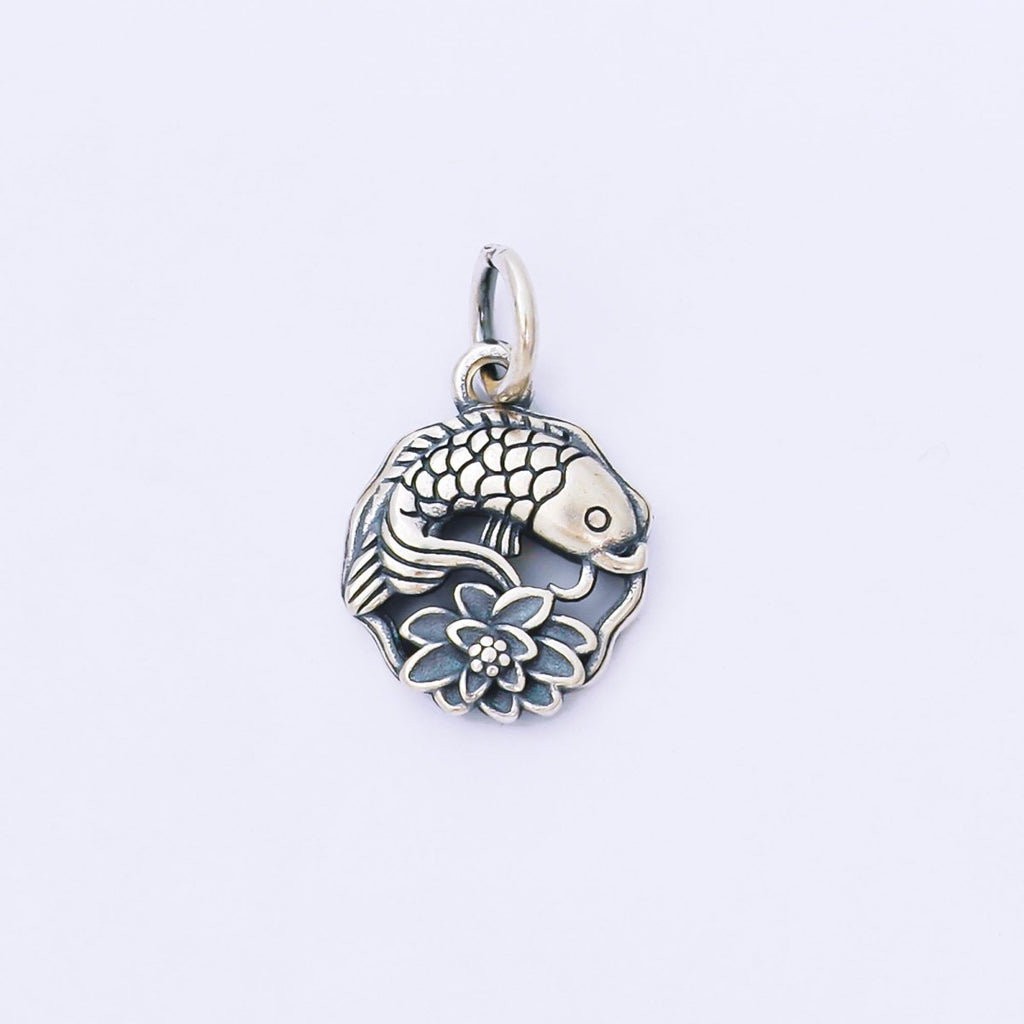 S925 Sterling Silver 15mm Lucky Lotus Flower Koi Fish Round Charm | SL-692