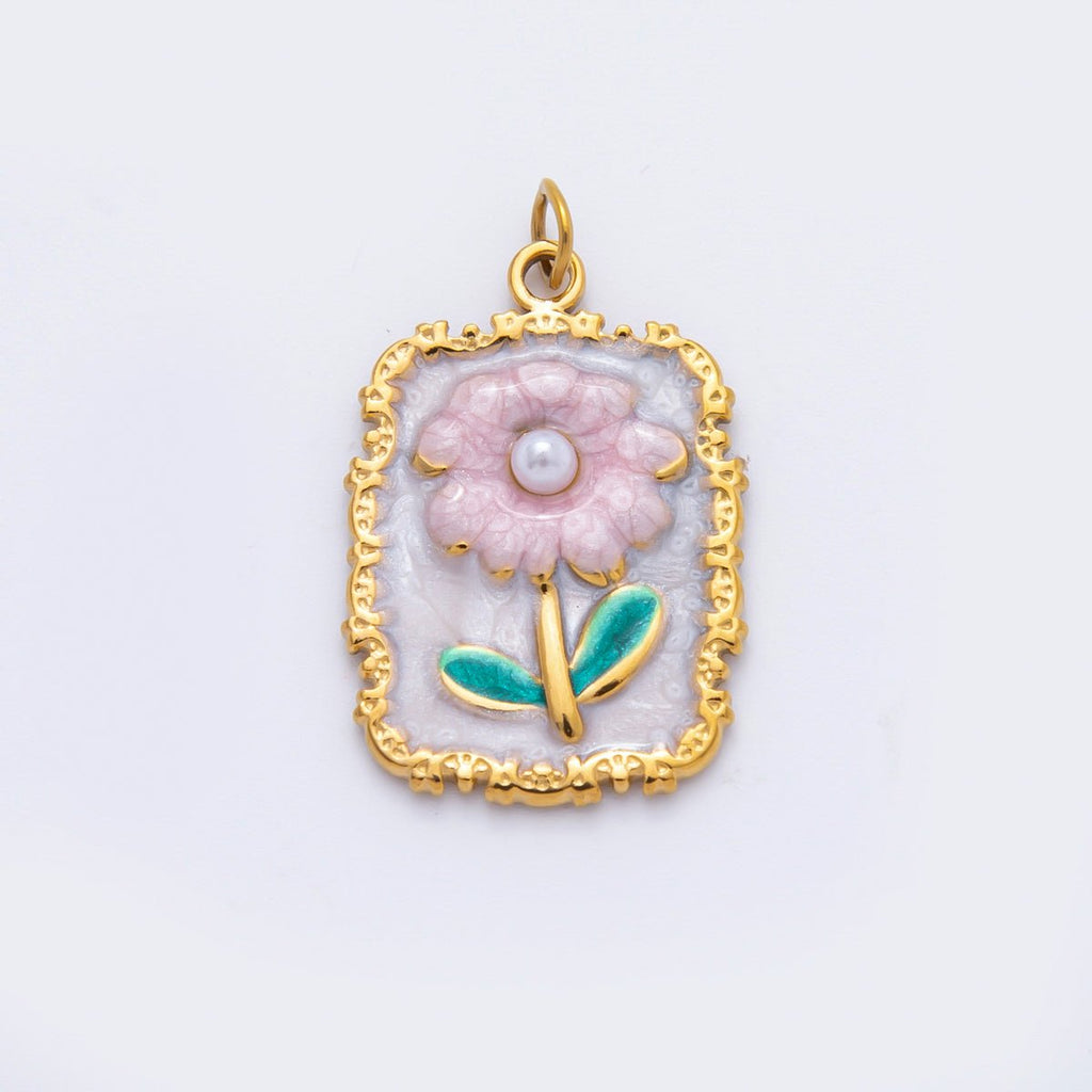 Stainless Steel Pink Daisy Flower Enamel Geometric Tag Rectangular Charm | C095
