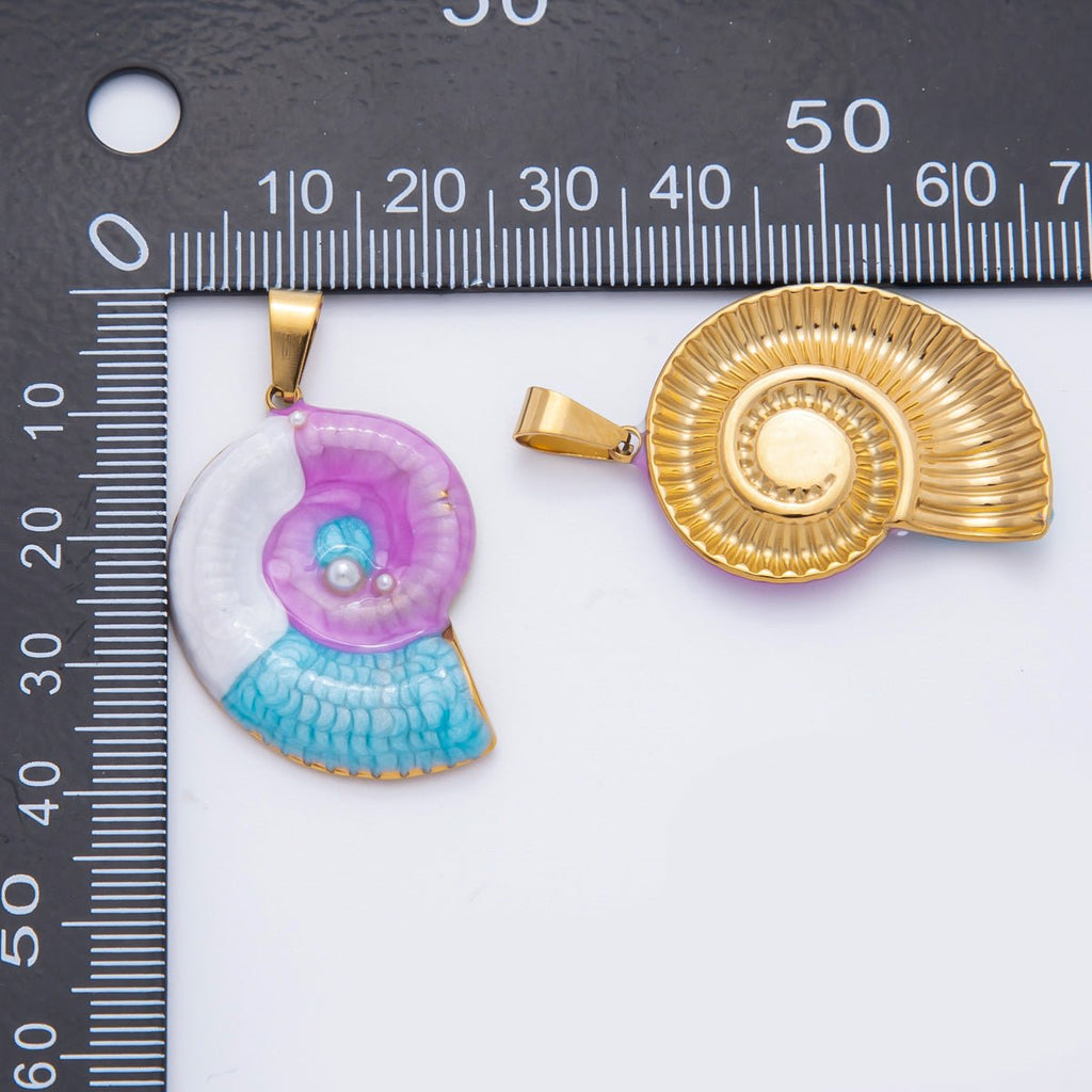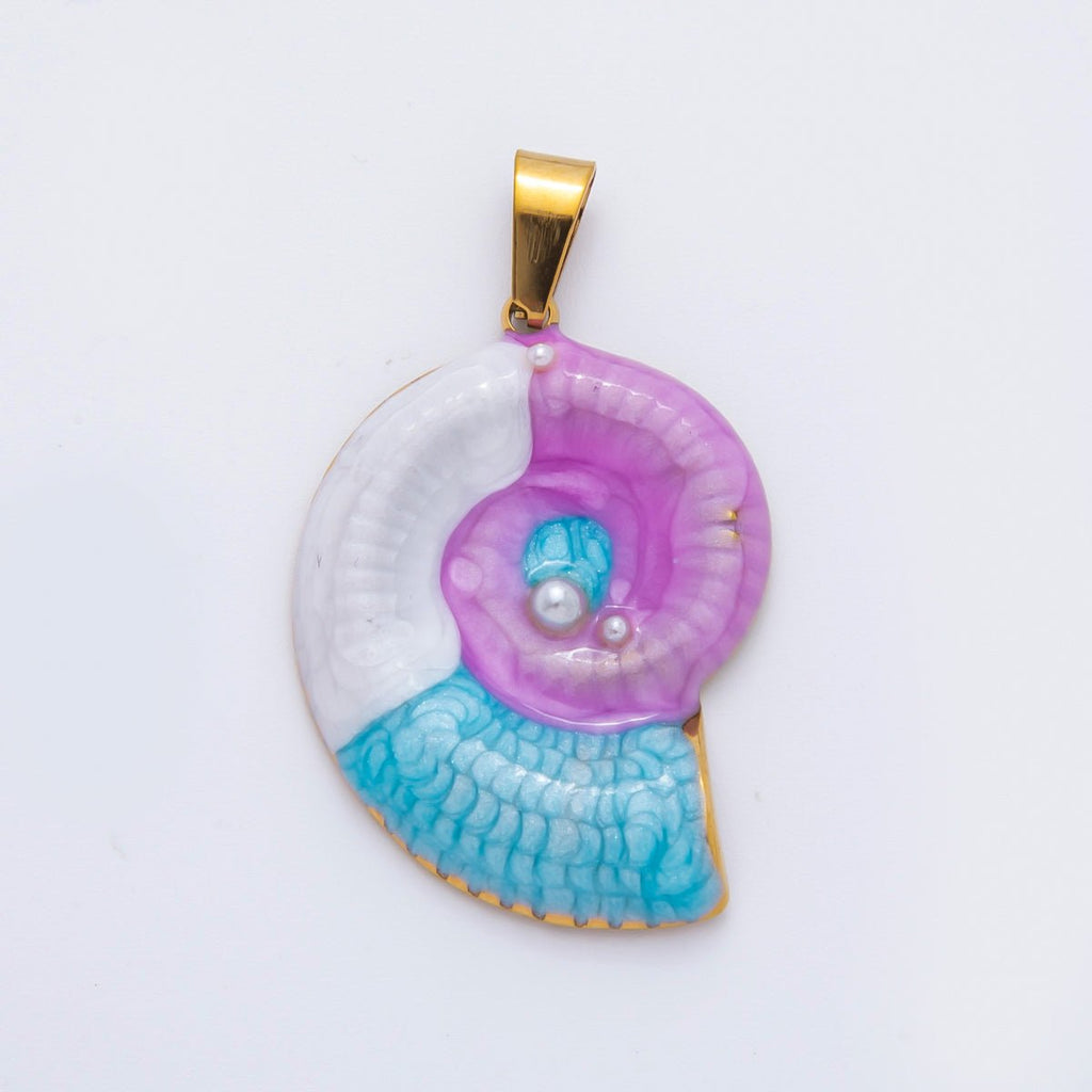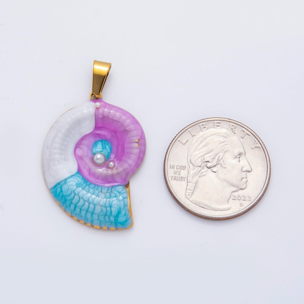 Stainless Steel 40mm Blue & Purple Enamel Art Nautical Ammonite Shell Pendant | P-836