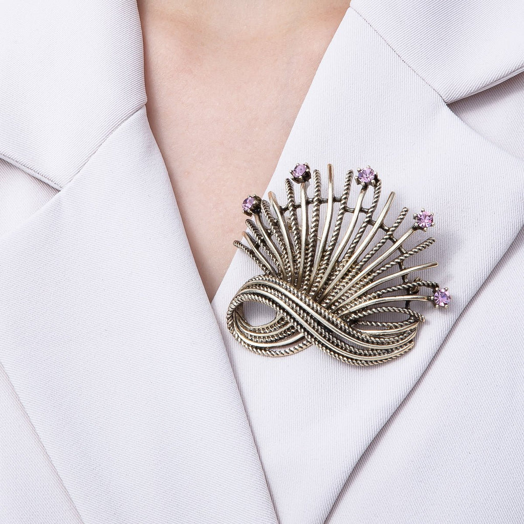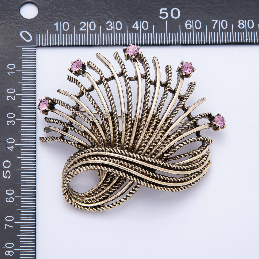 Vintage Gold 68mm x 67mm Pink Rhinestone Curved Geometric Pin Brooch | BH-079