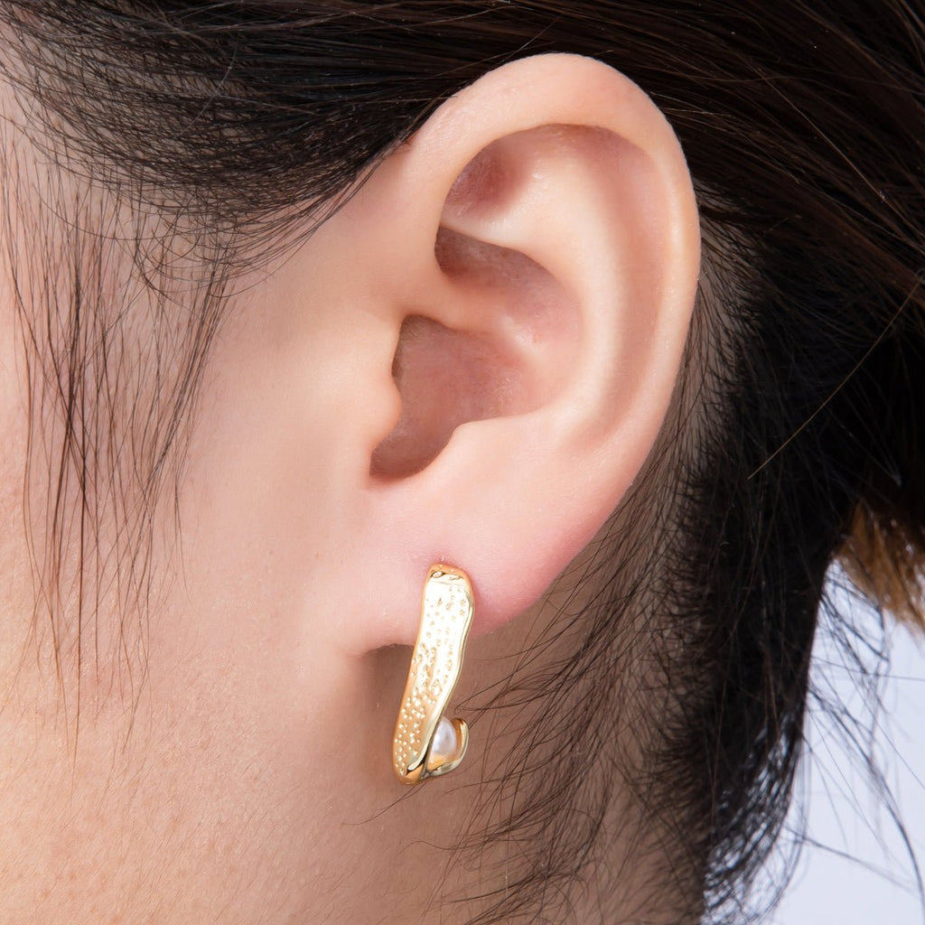 14K Gold Filled 22mm Shell Pearl Hammered J-Shaped Hoop Earrings | Earrings-00051