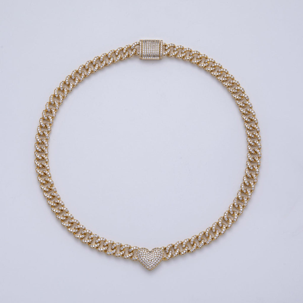 14K Gold Filled 9.5mm Heart Micro Paved CZ Curb Chain 18 Inch Necklace | WA-4090