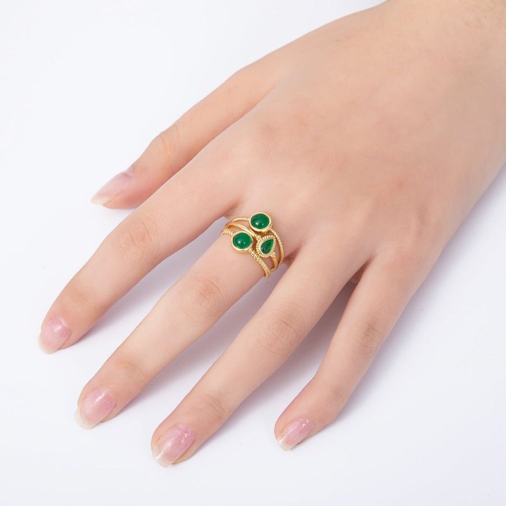 16K Gold Filled Green Gemstone Geometric Croissant Twist Triple Band Ring | Rings-00031