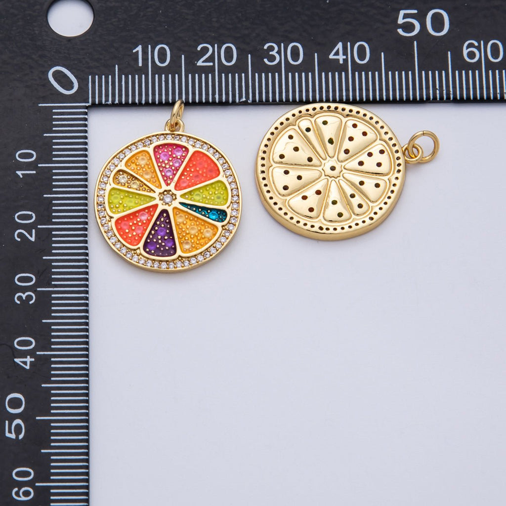 18K Gold Filled 25mm Micro Paved CZ Rainbow Citrus Slice Fruit Medallion Charm | Charms-00138