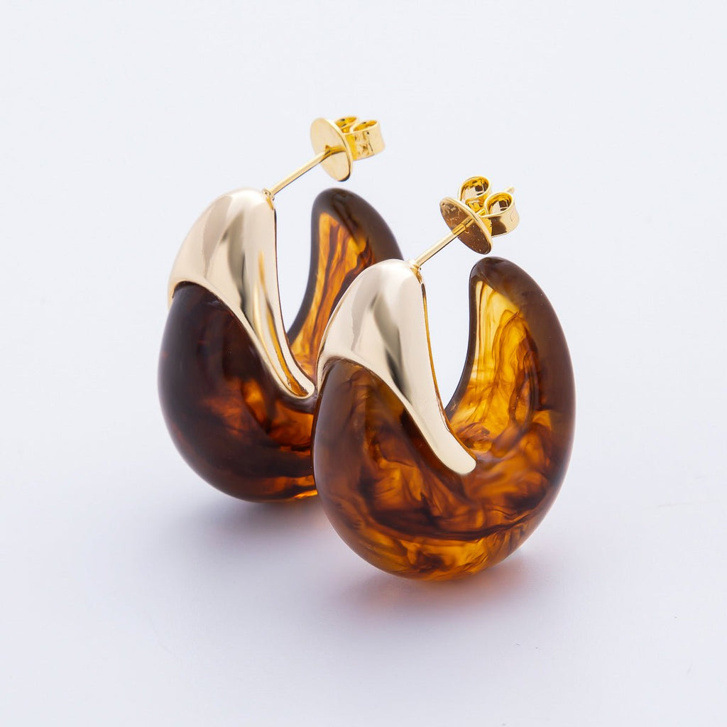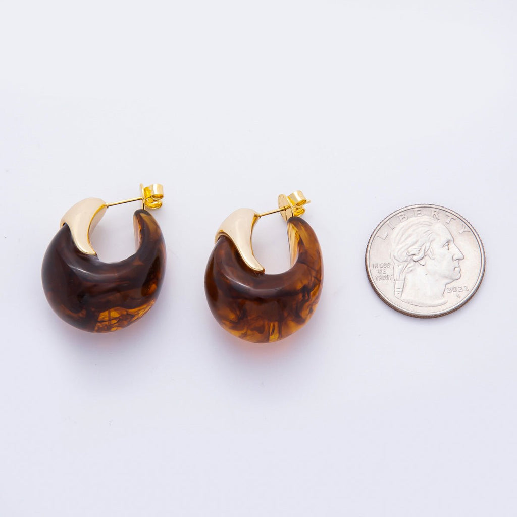 18K Gold Filled 34mm Blue, White, Brown Resin Dreamy Retro J-Shaped Hoop Earrings | AJ249 - AJ252