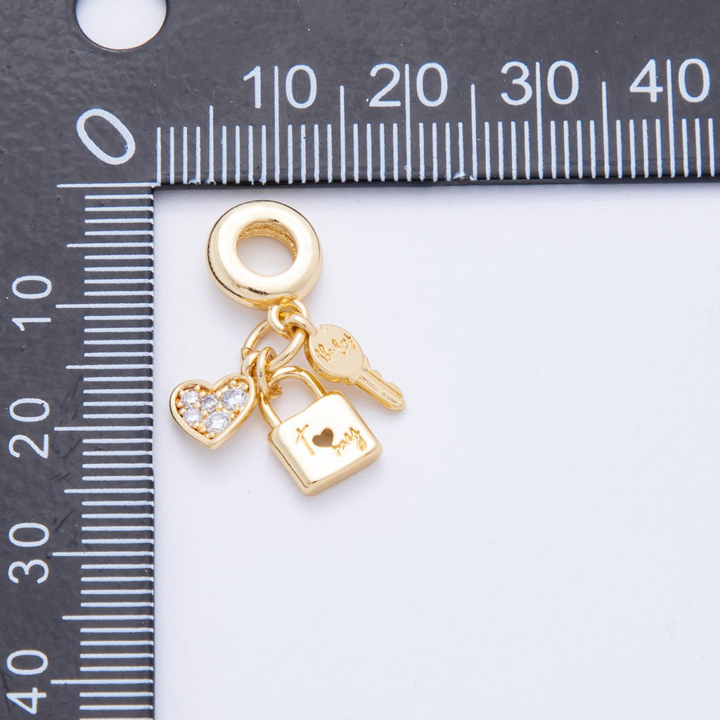 18K Gold Filled Micro Paved CZ Padlock Key Heart Rondelle Drop Charm | E716