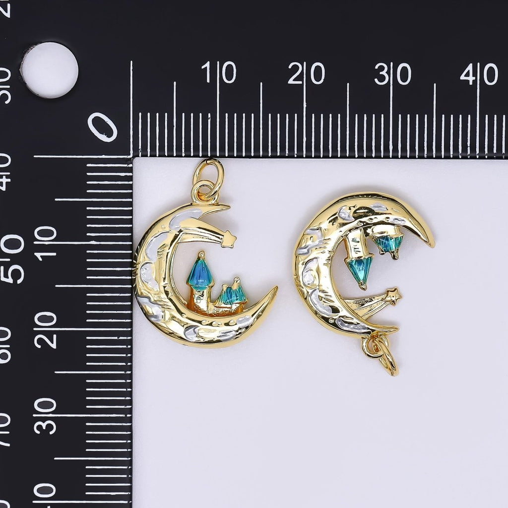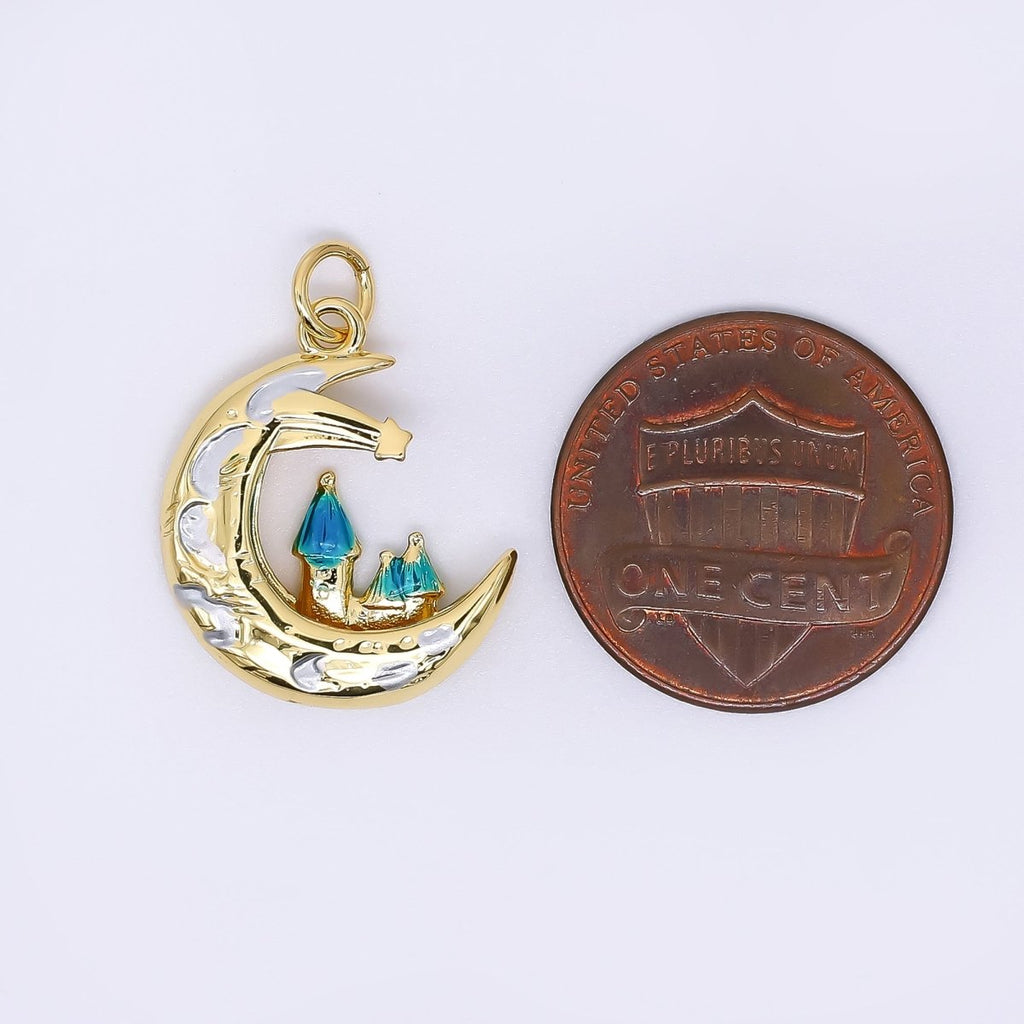 24K Gold Filled 19.5mm Enamel Art Crescent Moon Shooting Star Fantasy City Charm | AF-519