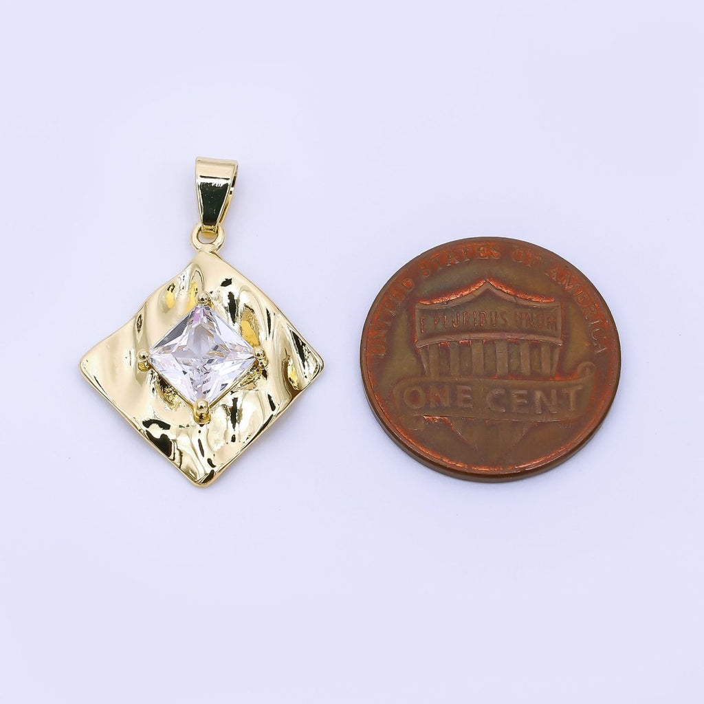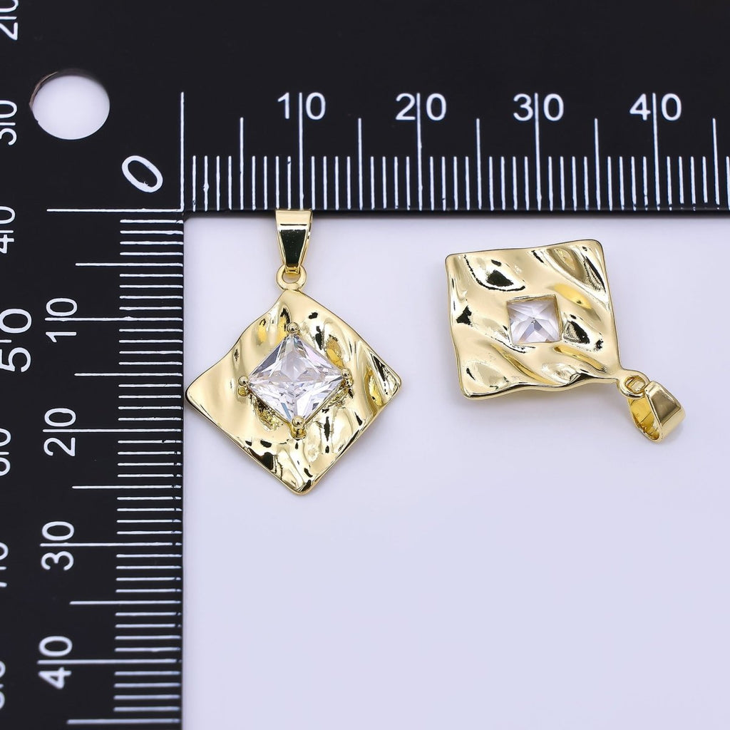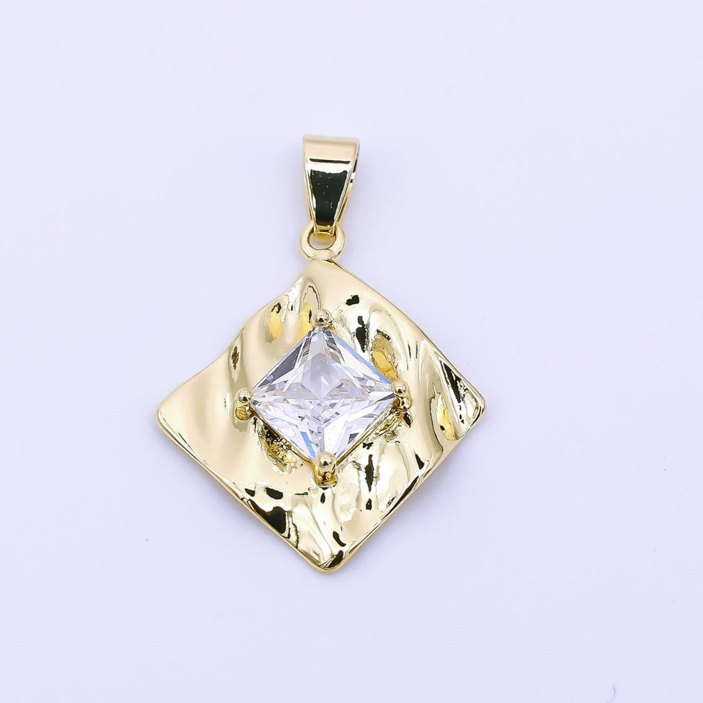 24K Gold Filled 20.5mm Square CZ Hammered Square Pendant | AH-537