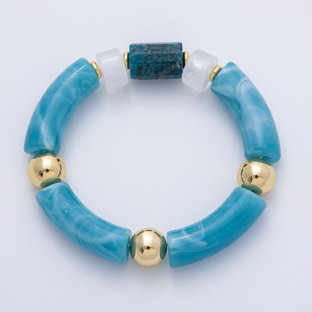 6mm Blue Aquamarine Gemstone Tube Round Ball Bead Stretch Bracelet | WA-4138