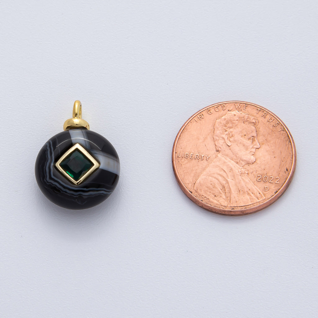 18K Gold Filled 18mm Black Agate with Emerald Green CZ Round Natural Gemstone Pendant | AF1449