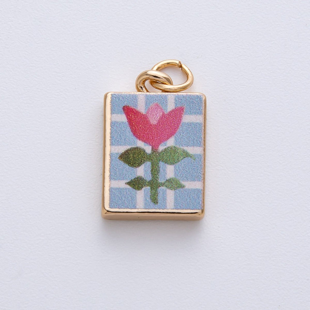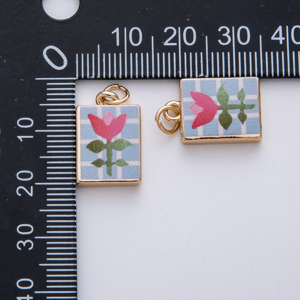 18K Gold Filled 18mm Pink Flower Blue Enamel Rectangular Charm | AF1598