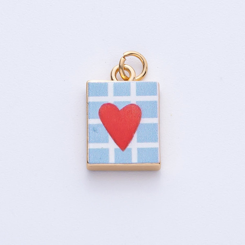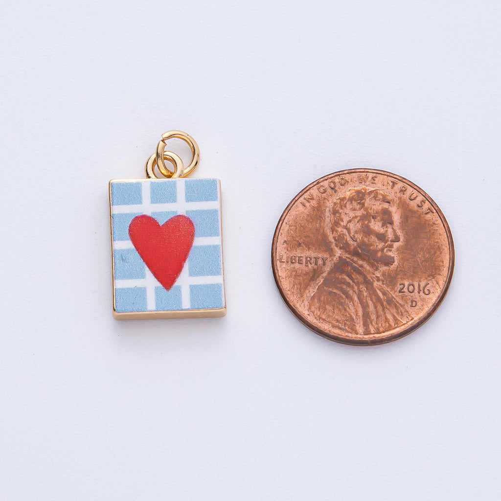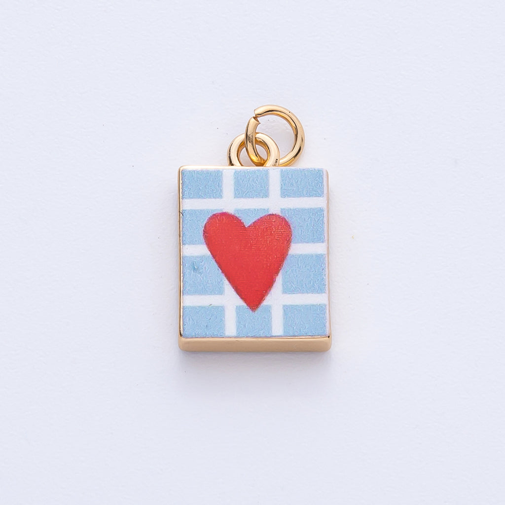 18K Gold Filled 18mm Red Heart Blue Enamel Rectangular Charm | AF1600