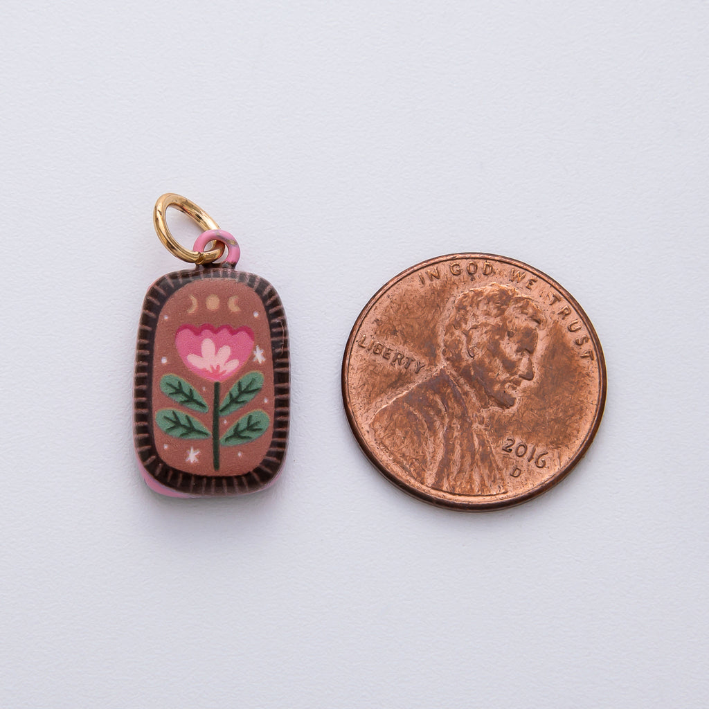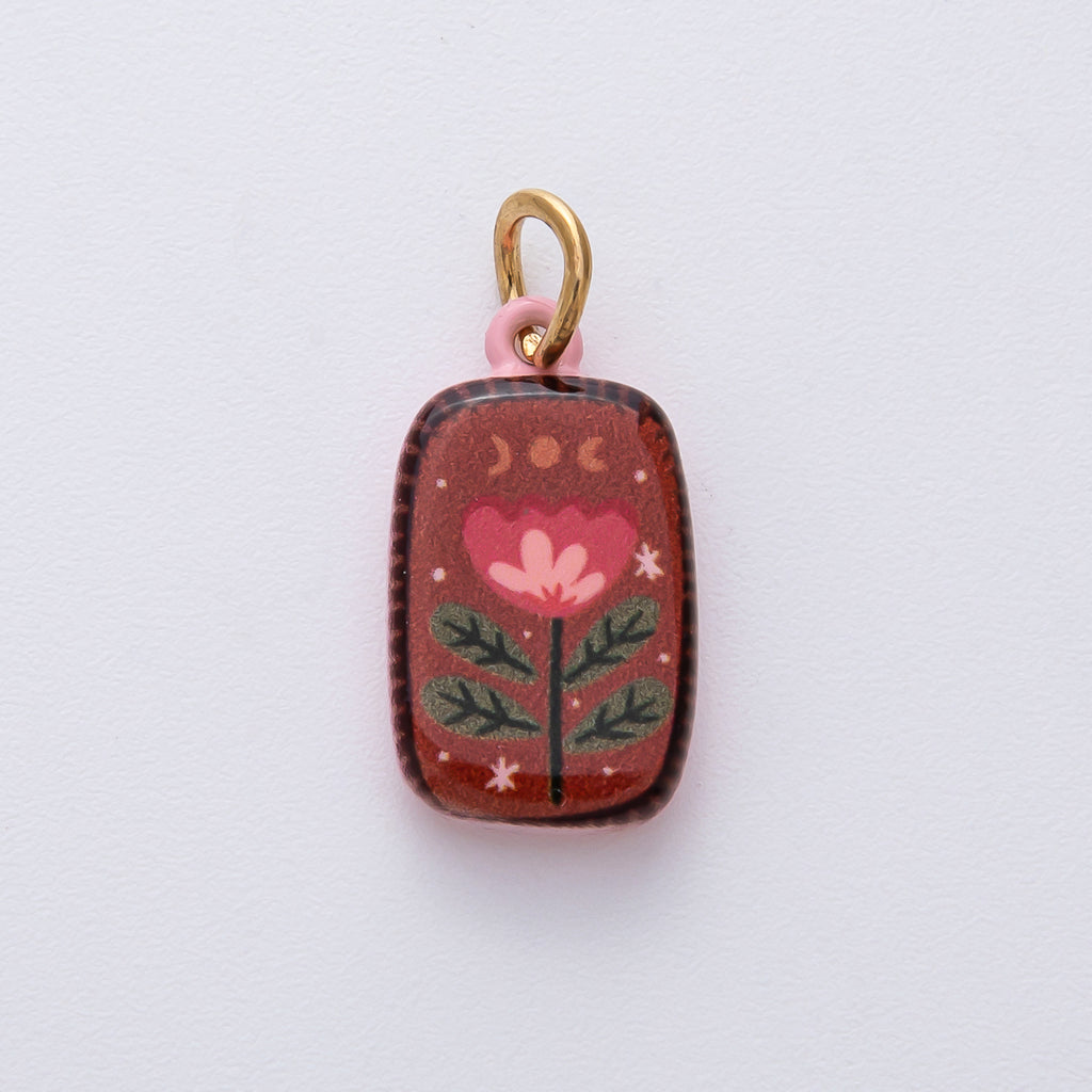 18K Gold Filled 20.5mm Red Brown Flower Enamel Double Sided Rectangular Charm | D420