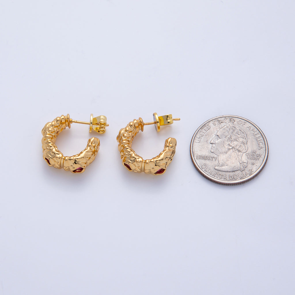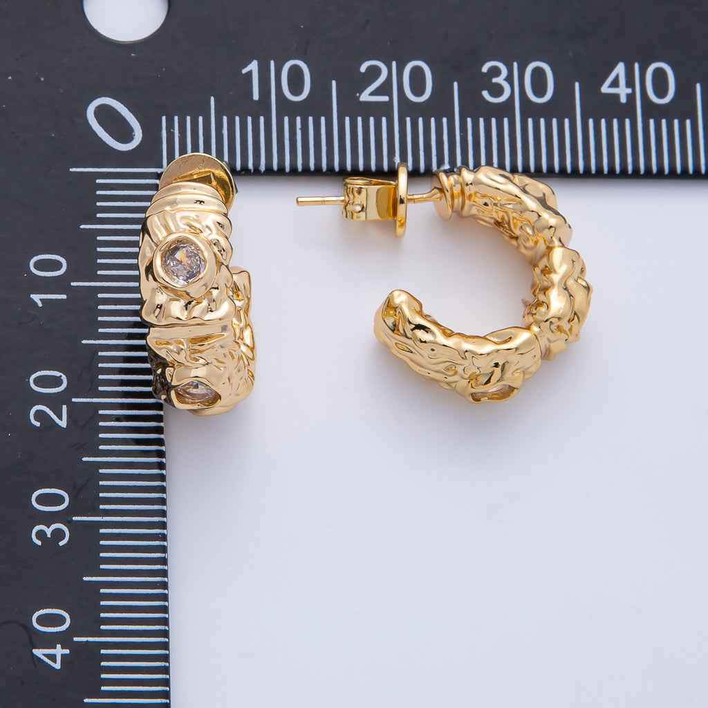 18K Gold Filled 20mm Fuchsia, Clear CZ Hammered Molten C-Shaped Hoop Earrings | AE623 AE624
