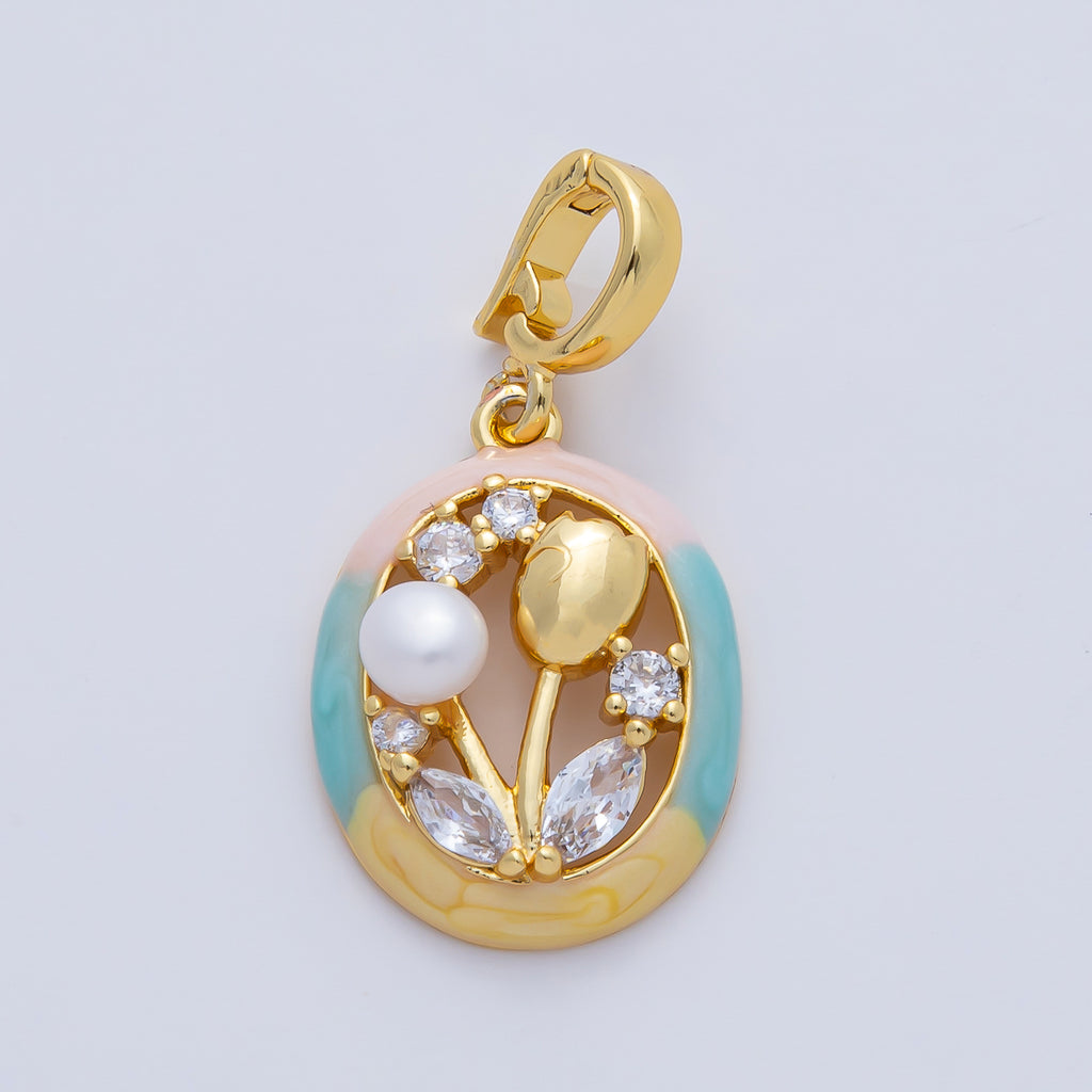 18K Gold Filled 22mm Tulip Flower CZ Shell Pearl Oval Snap Latch Pendant | AF1190