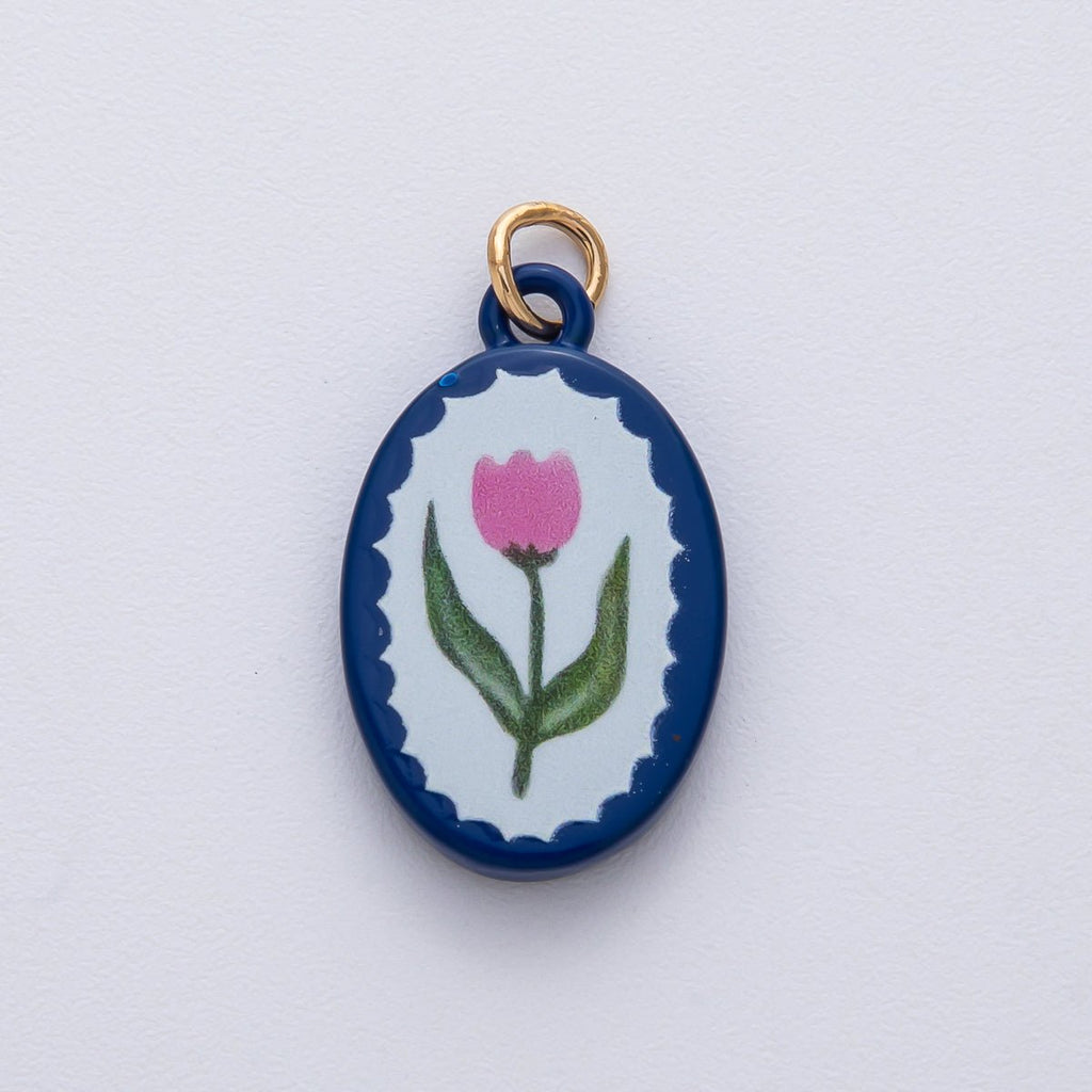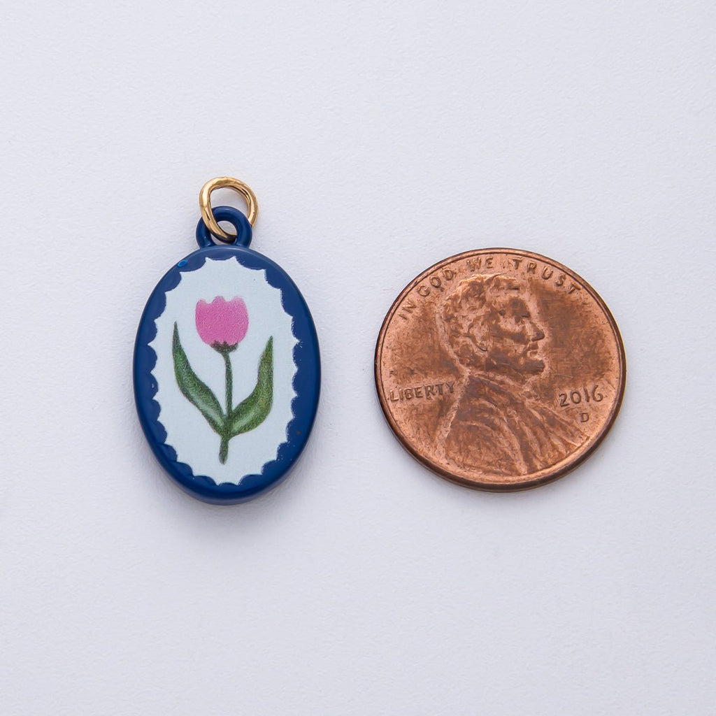 18K Gold Filled 23mm Pink Blue Enamel Flower Oval Charm | AF1624