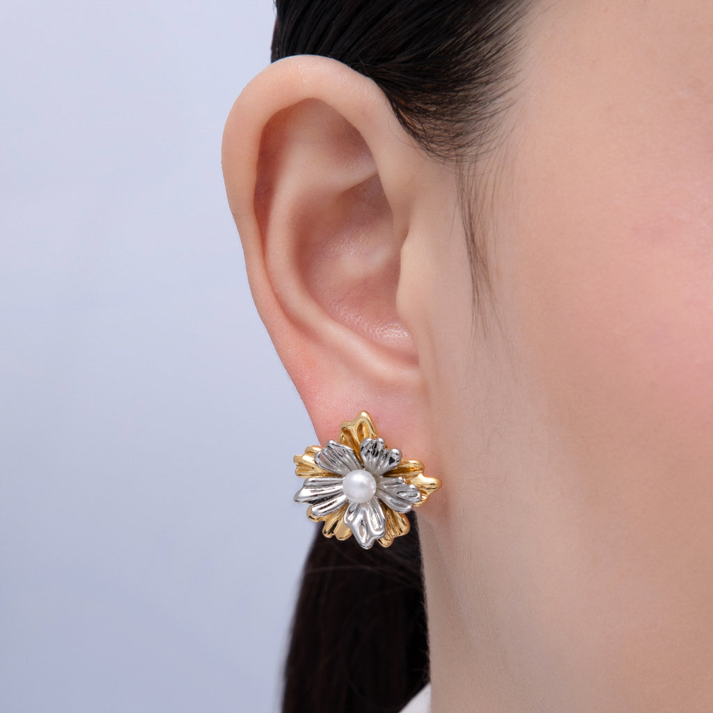 18K Gold Filled 23mm Shell Pearl Mixed Metal Flower Stud Earrings | AD1685