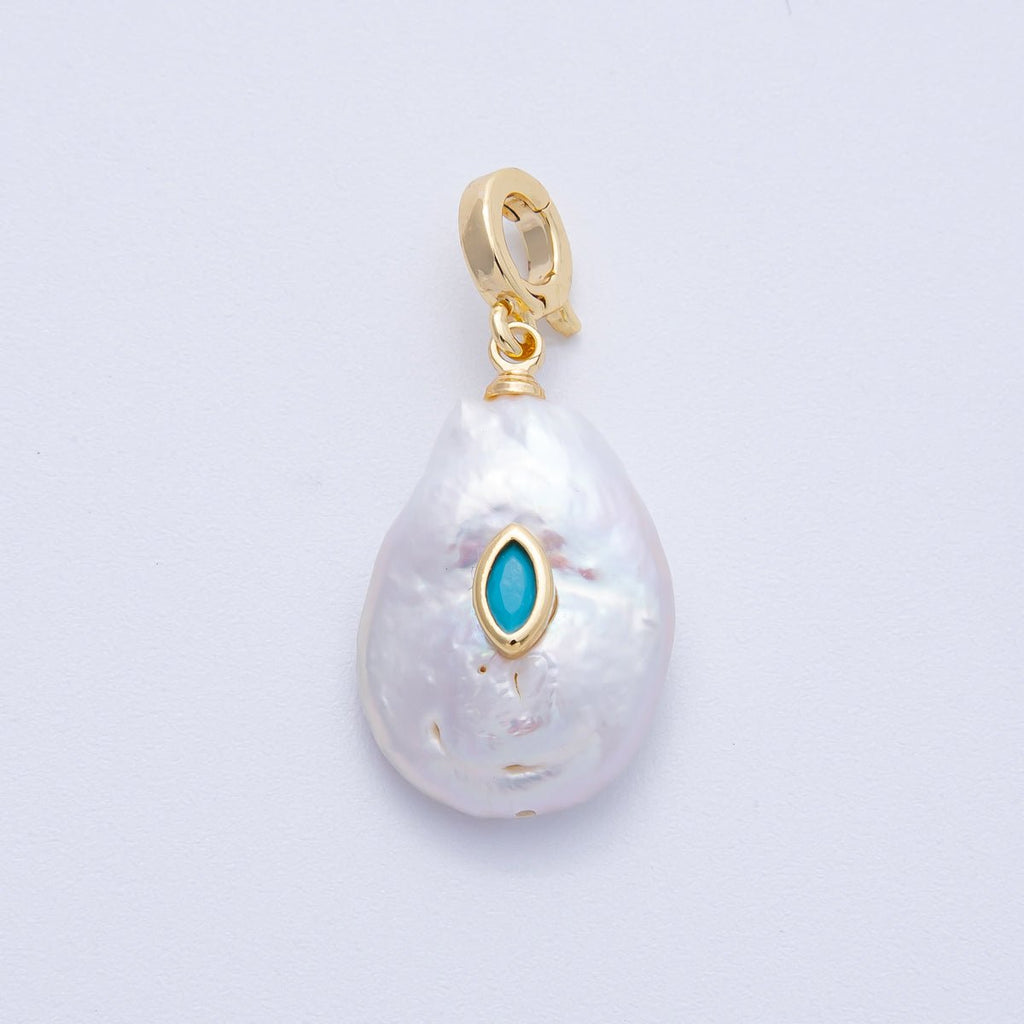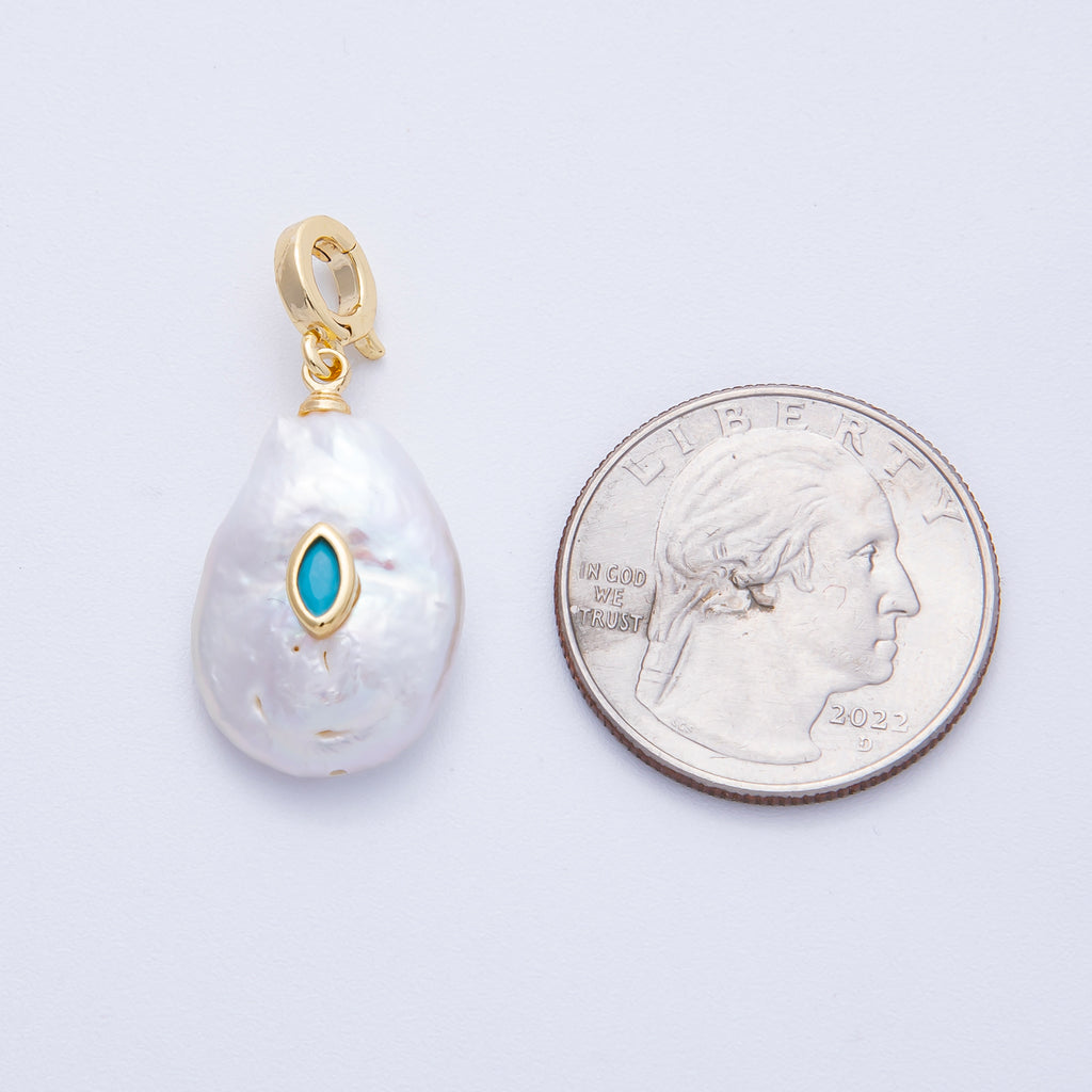 18K Gold Filled 24mm Turquoise, Green CZ Marquise Freshwater Pearl Snap Latch Pendant | AF641