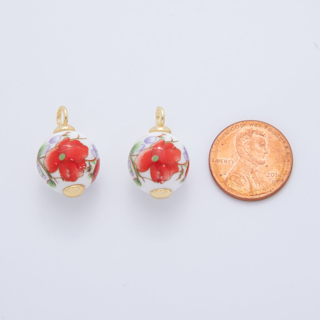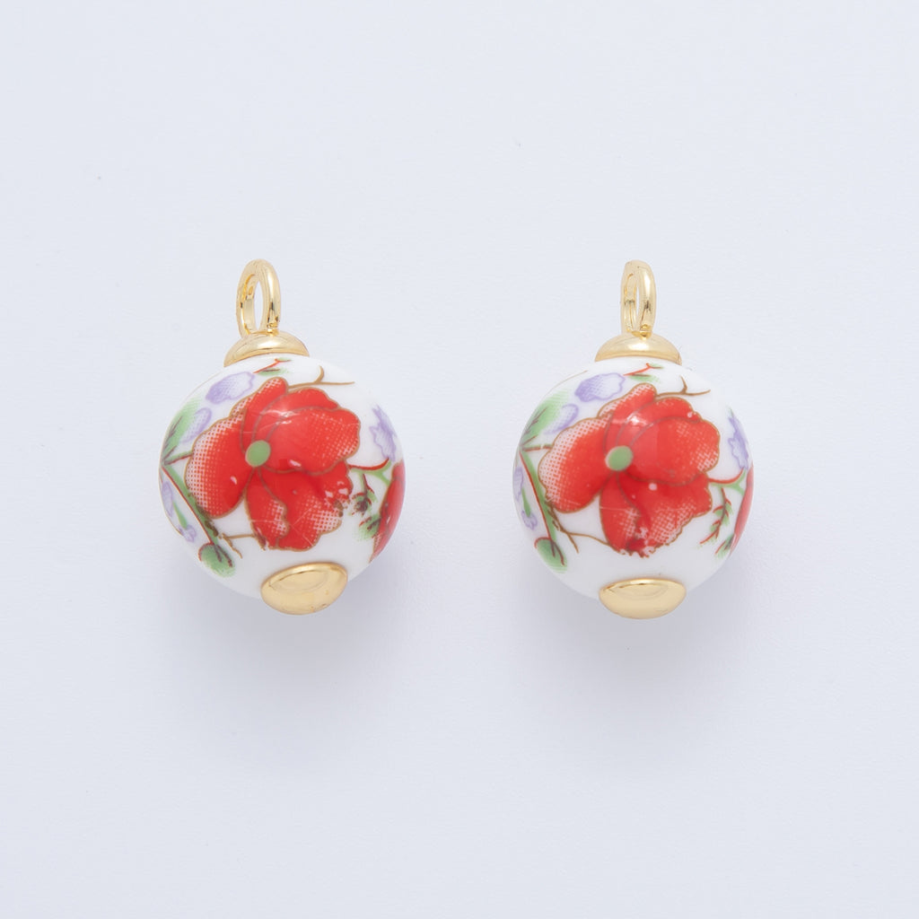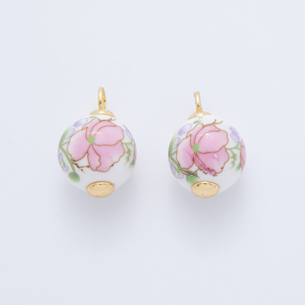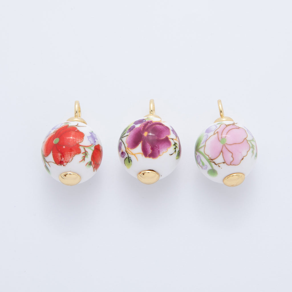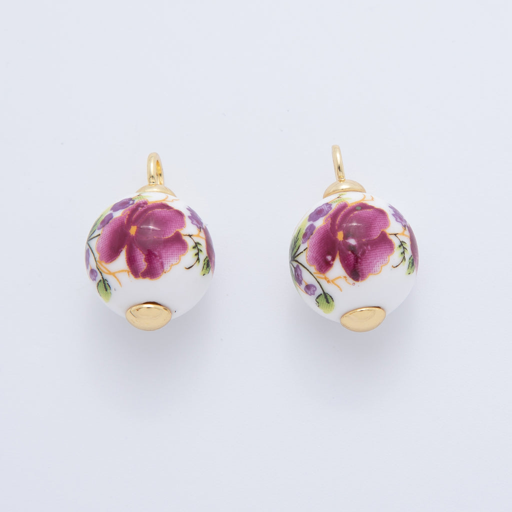 18K Gold Filled 21mm Pink, Purple, Red Violet Flower Round Ceramic Drop Pendant | AF700 AF701