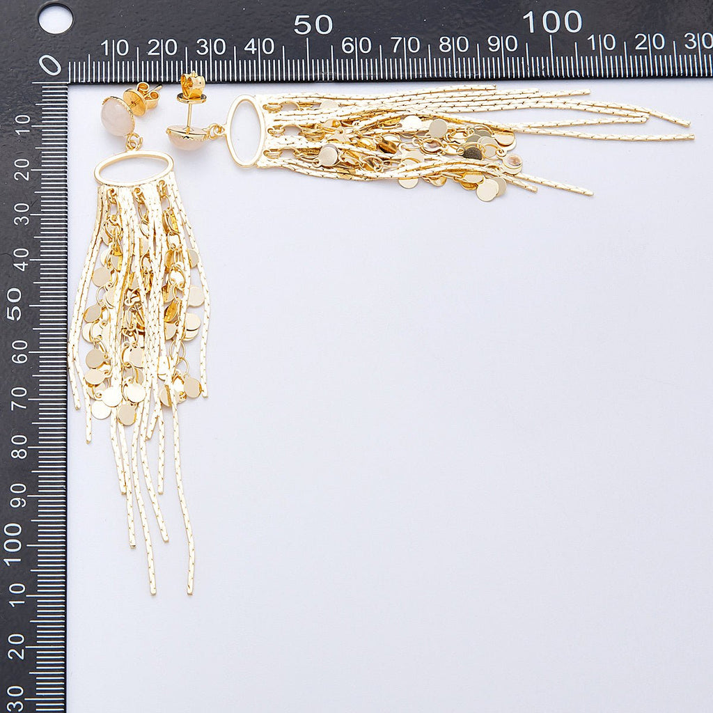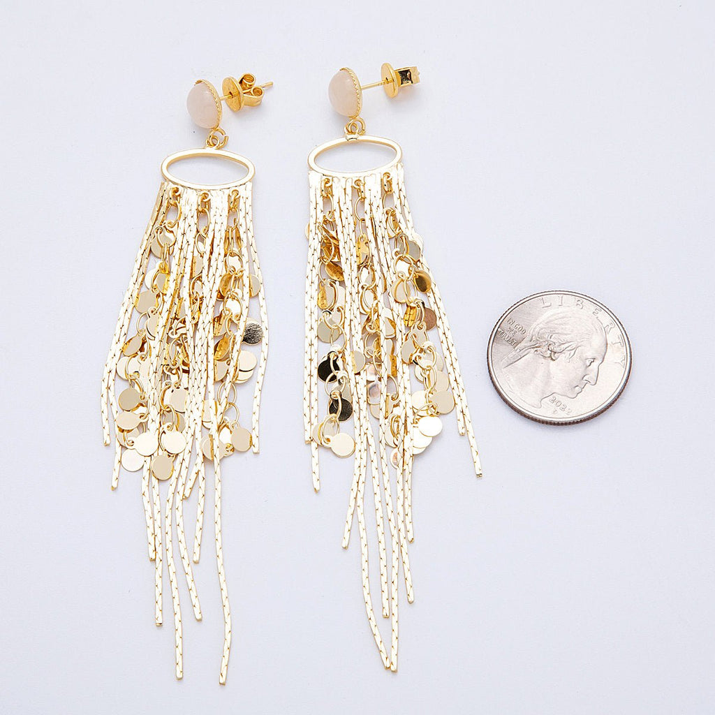 18K Gold Filled Rose Quartz Round Fringe Statement Drop Stud Earrings | Earrings-00294