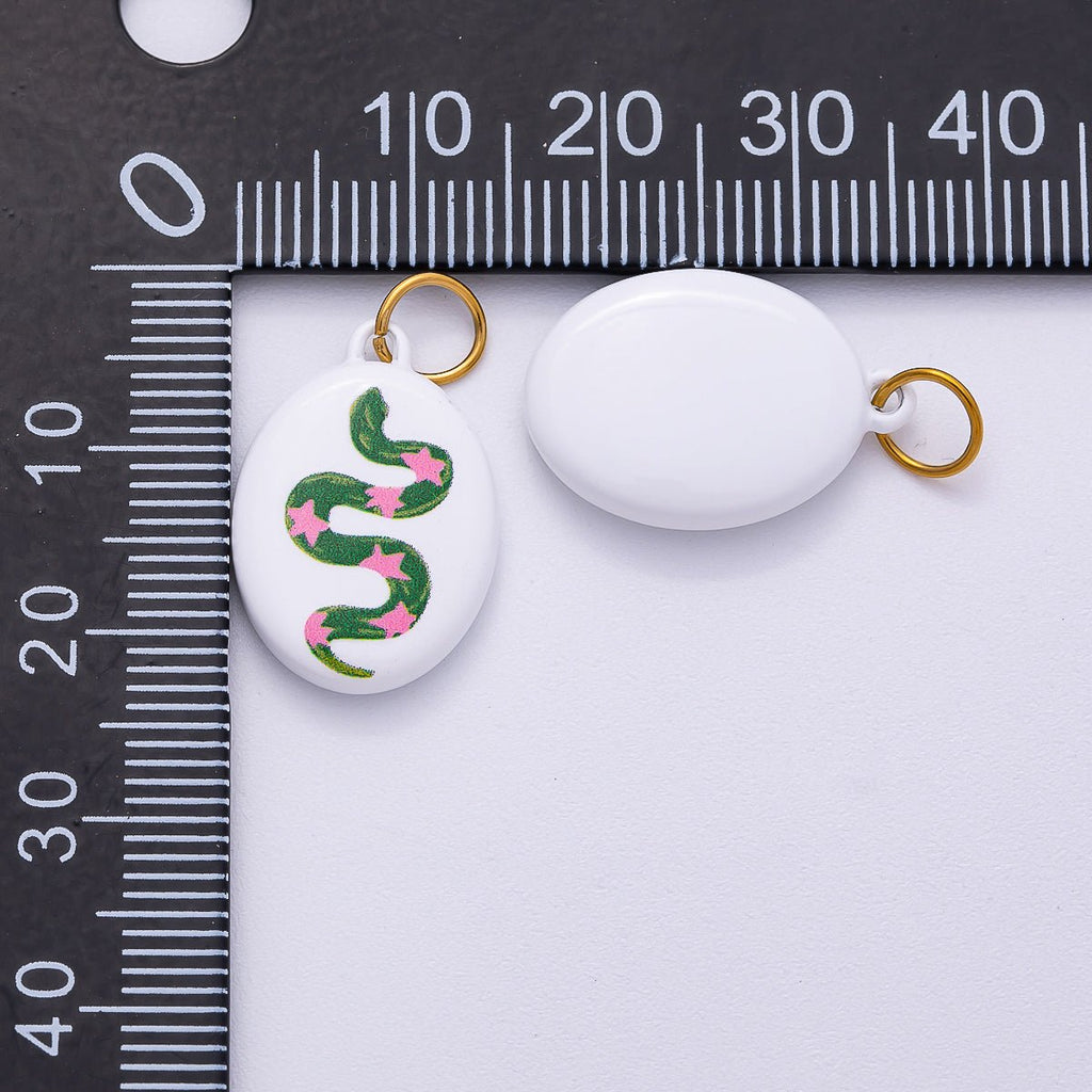 PVD Stainless Steel 20mm Green Snake Pink Star White Enamel Oval Charm | Charms-00503