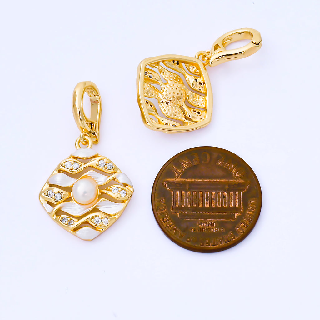 24K Gold Filled 18mm Micro Paved CZ Shell Pearl Wavy Rhombus Tag Pendant | AA1655