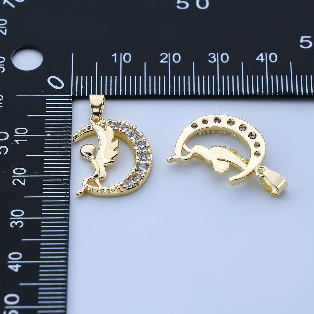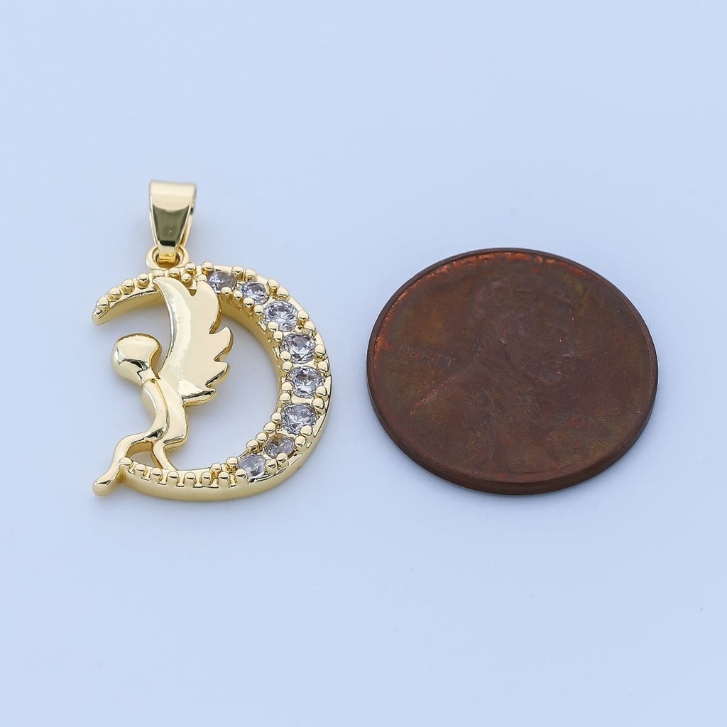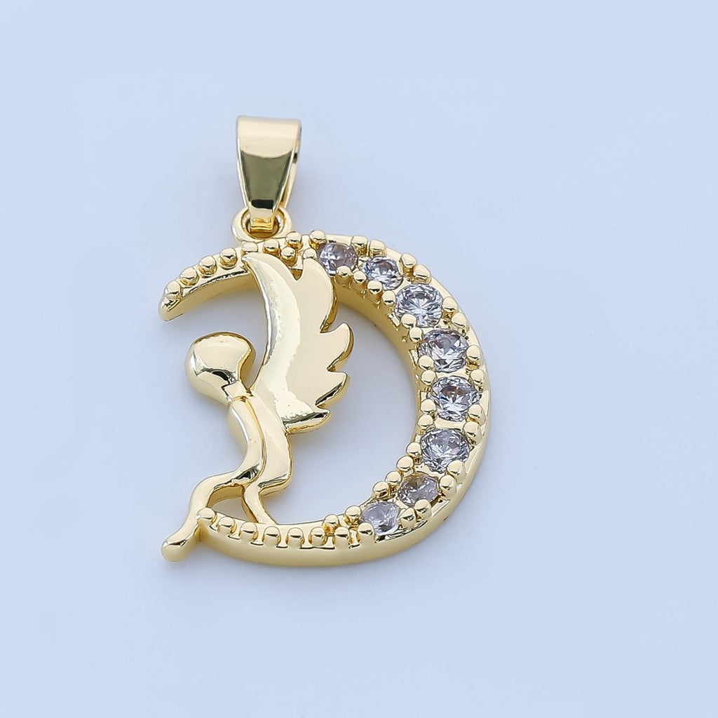 24K Gold Filled 20mm Micro Paved CZ Crescent Angel Moon Pendant | AH-519